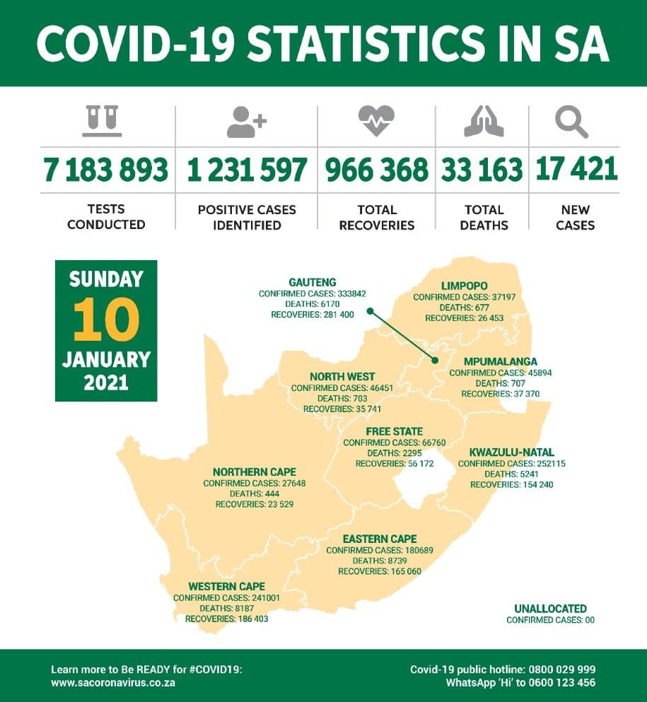 当地时间1月10日,南非卫生部确认南非当天新增新冠肺炎确诊病例17421例,累计确诊1231597例;新增死亡病例339例,累计死亡33163例;累计康复966368例。