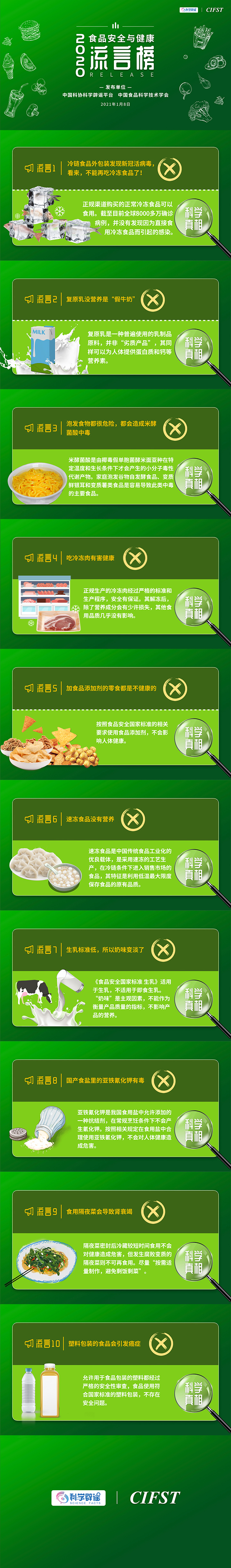 新华网北京1月11日电(胡可璐)1月8日,中国科协科学辟谣平台与中国食品科学技术学会共同发布了“2020年食品安全与健康流言榜”,通过科技界共识,肃清食品安全谣言,用科学的声音营造清朗的网络空间。2020,关于食品的这些流言千万别信了,来看权威专家辟谣。