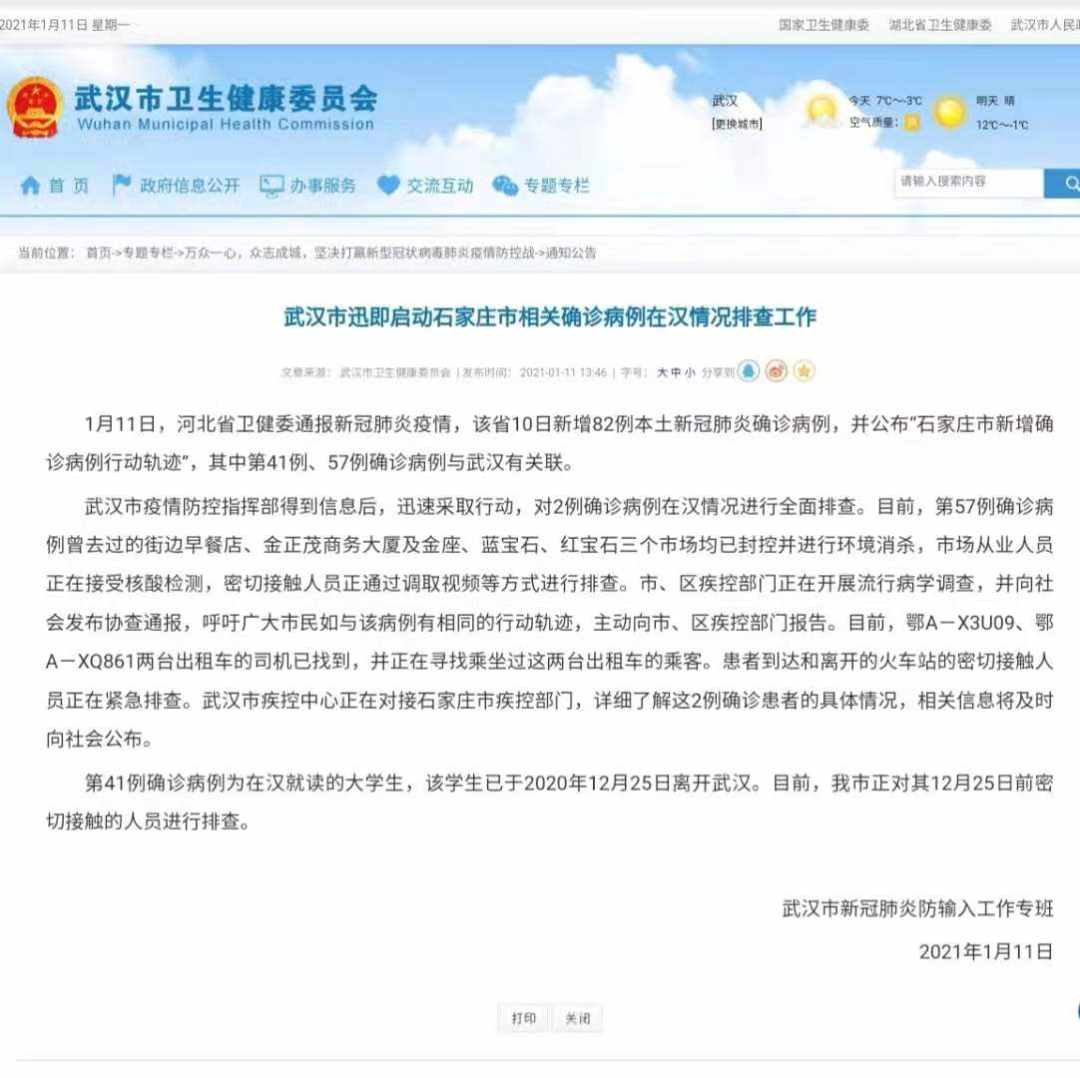 1月11日,河北省卫健委通报新冠肺炎疫情,该省10日新增82例本土新冠肺炎确诊病例,并公布“石家庄市新增确诊病例行动轨迹”,其中第41例、57例确诊病例与武汉有关联。