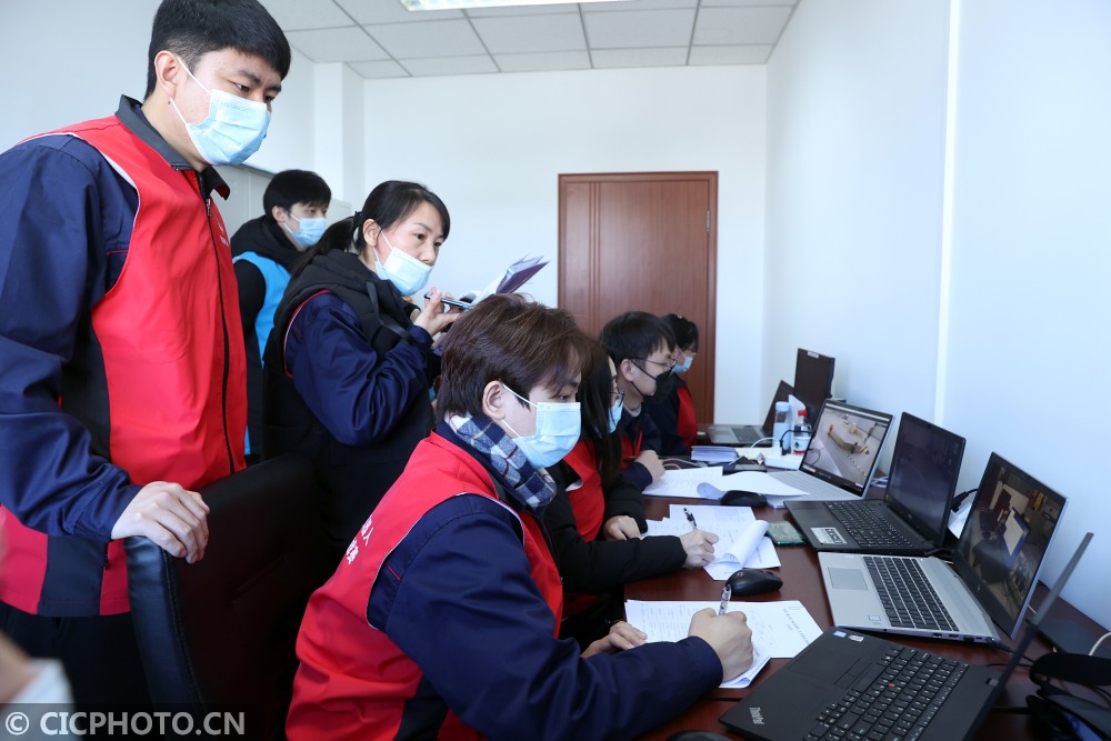 ↑2021年1月9日,北京丰台中国航天科工三院举办首届“航天杯”移动机器人AI创新技术挑战赛,裁判员在做赛前准备工作。CICPHOTO/封晓东 摄