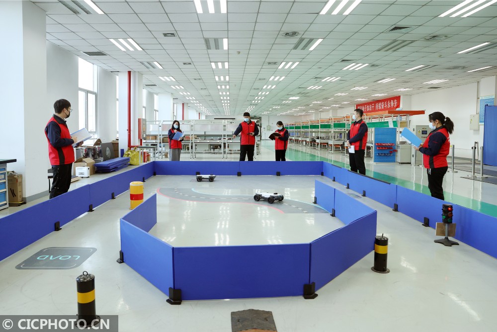 ↑2021年1月9日,北京丰台云岗中国航天科工三院举办首届“航天杯”移动机器人AI创新技术挑战赛,裁判员在工作中。CICPHOTO/封晓东 摄