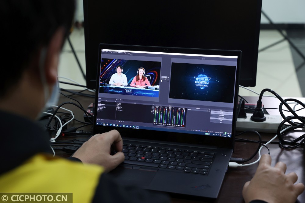 ↑2021年1月9日,北京丰台云岗中国航天科工三院举办首届“航天杯”移动机器人AI创新技术挑战赛,图为线上直播演播室。CICPHOTO/封晓东 摄