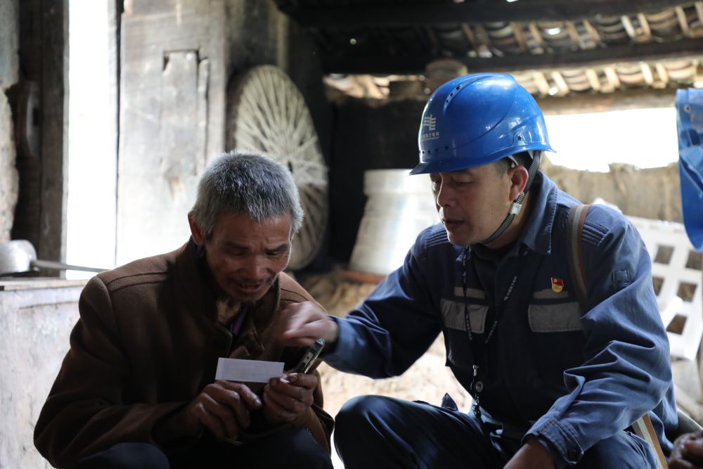 图为百色隆林供电局新州供电所梁祖林为五保户讲解减免电费政策