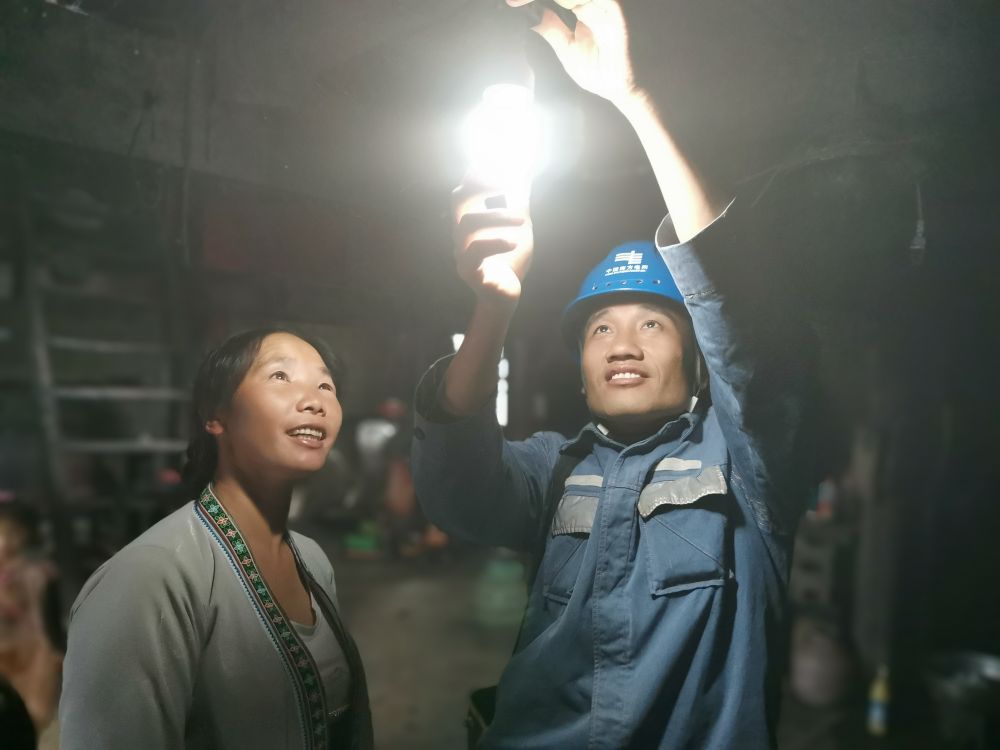 图为百色隆林供电局德峨供电所工作人员为低保户安装线路并通电测试