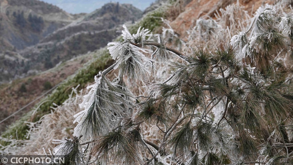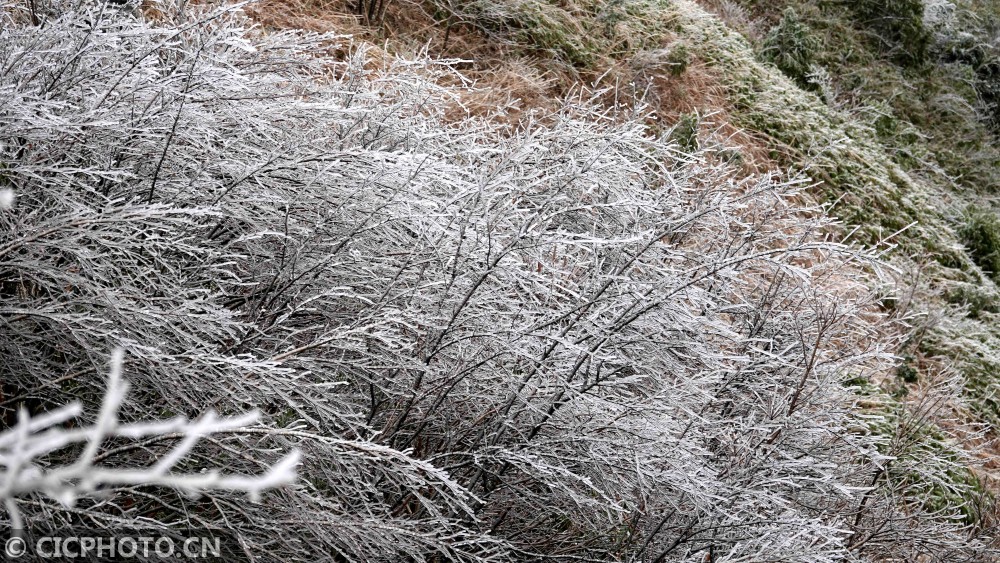 ↑2020年1月9日,广西环江毛南族自治县龙岩乡朝阁草甸的树枝上挂满冰挂。CICPHOTO/高东风 摄