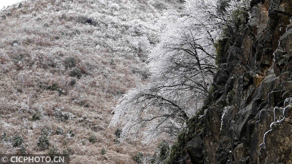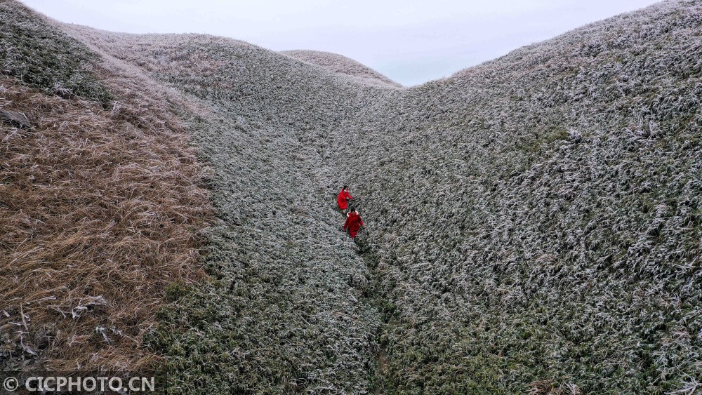 ↑2020年1月9日,广西环江毛南族自治县龙岩乡朝阁草甸披上“冰衣”。CICPHOTO/高东风 摄