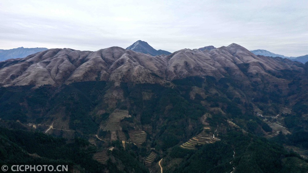 ↑2020年1月9日,在广西环江毛南族自治县龙岩乡朝阁村,披上“冰衣”的高处草甸与低处的青山“泾渭分明”。CICPHOTO/高东风 摄