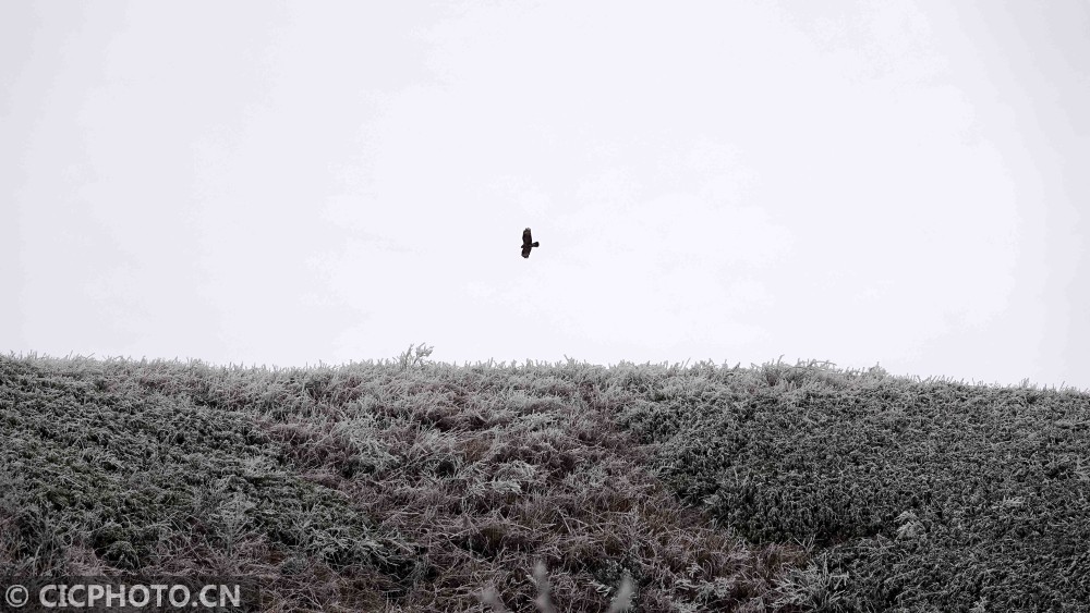↑2020年1月9日,一只鸟从广西环江毛南族自治县龙岩乡朝阁草甸上空掠过。CICPHOTO/高东风 摄