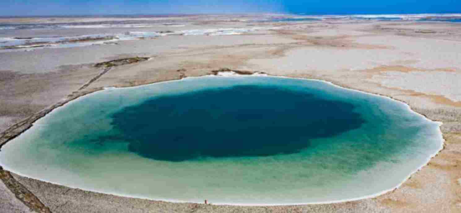 据悉,地球上最大的蓝洞为加勒比海西岸洋中的伯利兹大蓝洞,有305米的口径,123米的洞深,为潜水胜地。茫崖尕斯地区最大的蓝洞窄处圆直径约225米、最宽280米左右,可能为柴达木盆地最大的蓝洞,这轻描盐色的“蓝眼睛”为饱和卤水,里面没有鱼虾和水生植物,岸上不长芦苇、碱蓬草等,雁鸭水鸟很少靠近,这片“死海”美丽与危险并存着。