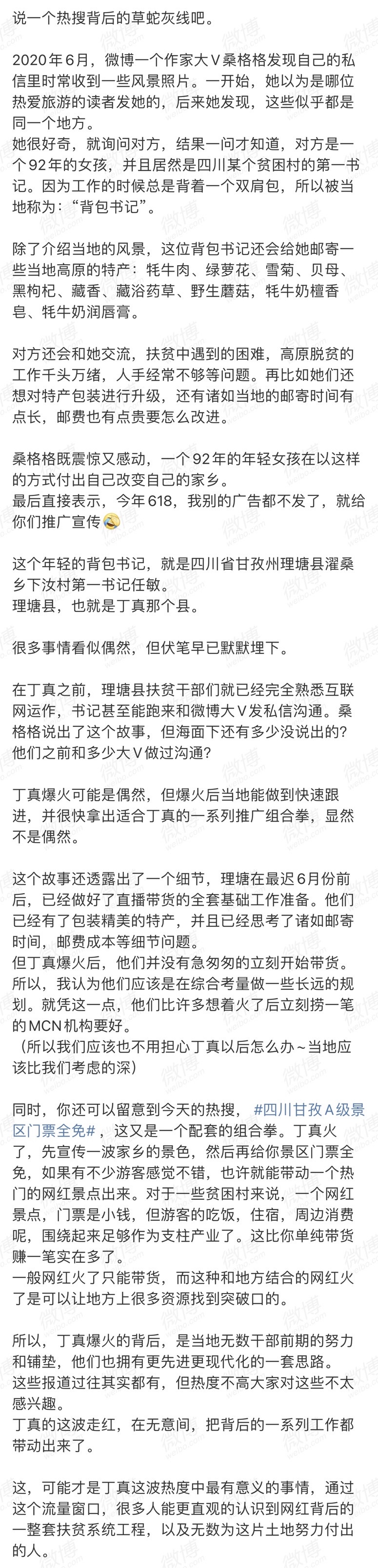 有网友发现,半年前,理塘的一位90后村第一书记已经开始和微博大V围绕当地的风景、扶贫、带货进行沟通交流。随后还有网友评论跟进说,为了通过旅游发展突围,当地曾举办过“最美康巴汉子选拔大赛”;理塘37岁书记驻村一年满头白发……“你看到满屏的丁真,其实都是脱贫攻坚,国计民生,是无数人的奋斗和汗水。”