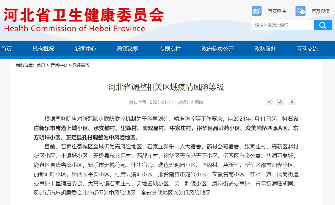 根据国务院应对新冠肺炎联防联控机制关于科学划分、精准防控等工作要求,自2021年1月11日起,将石家庄新乐市宝港上城小区、承安铺村、里辉村、南双晶村、牛家庄村,裕华区晶彩苑小区、众美廊桥四季A区、东方明珠小区,正定县孔村调整为中风险地区。