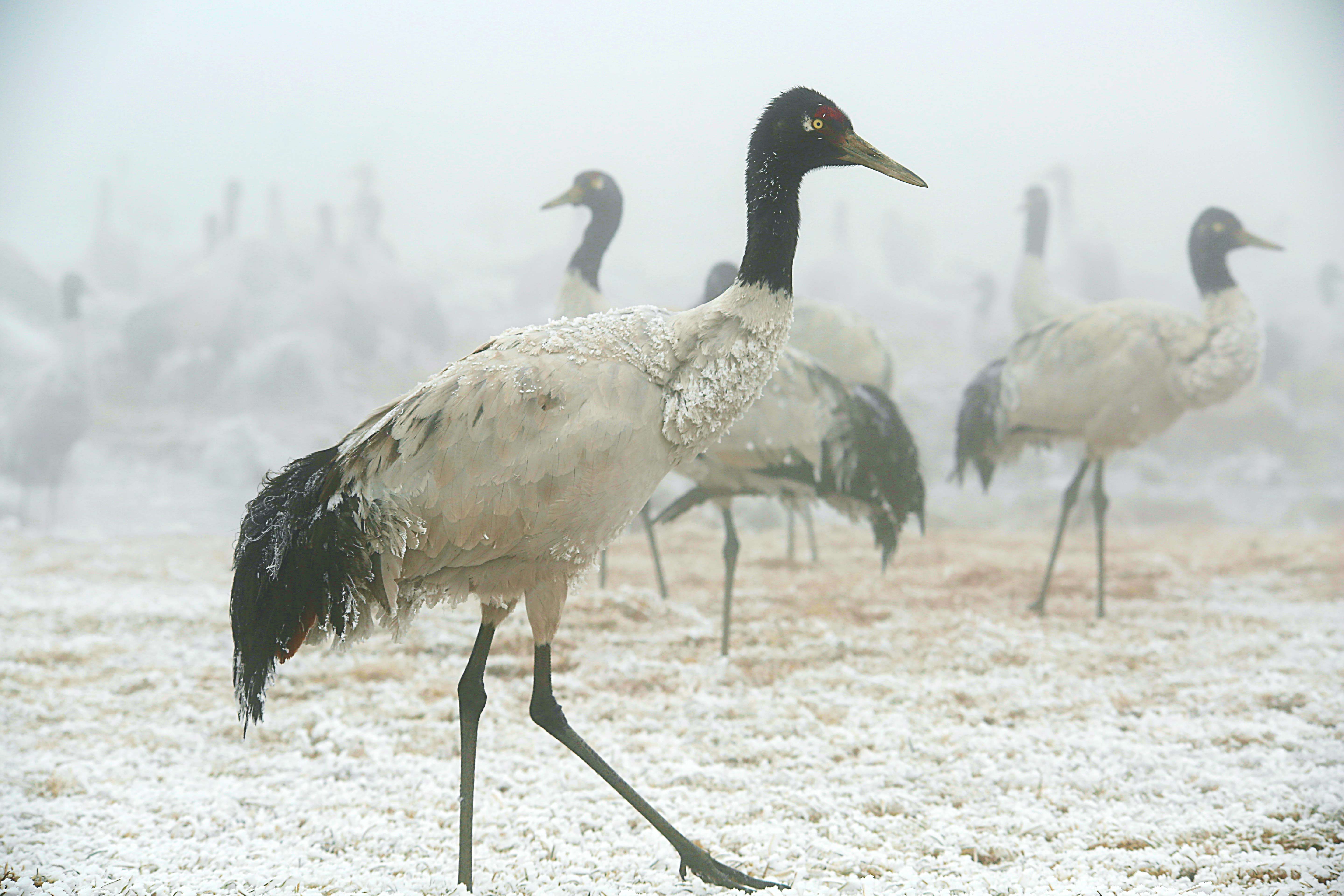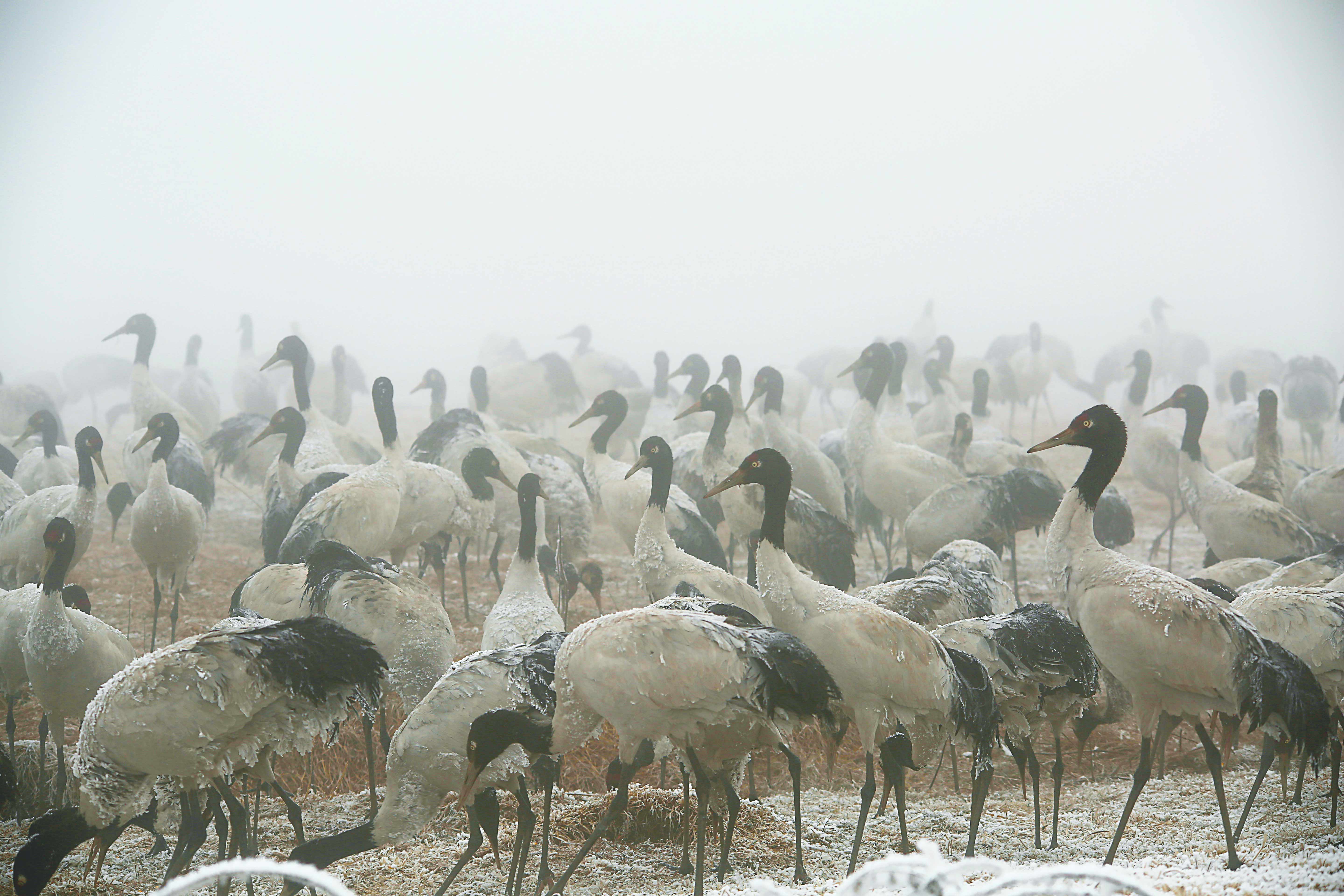 工作人员介绍,黑颈鹤属国家一级重点保护动物,栖息地被冰雪覆盖后,野外觅食变得十分困难,加之黑颈鹤是天生的“近视眼”,大雾天气下让它们飞行也变得艰难。