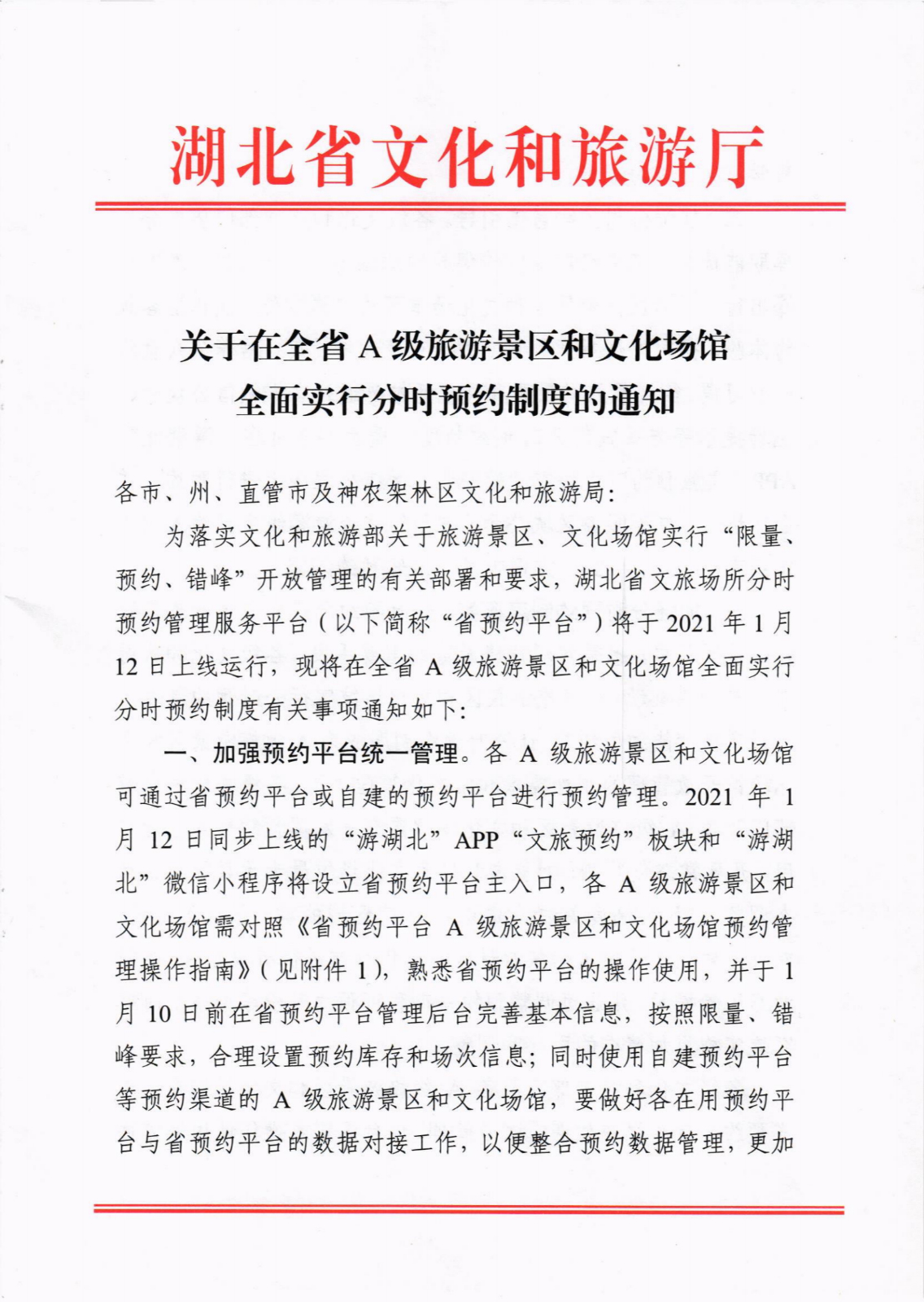 湖北各A级旅游景区和文化场馆可通过湖北省预约平台或自建的预约平台进行预约管理。湖北省文旅场所分时预约管理服务平台将于1月12日上线运行。广大游客可以通过“游湖北”客户端或“游湖北”微信小程序,访问预约平台进行分时预约。各A级旅游景区和文化场馆按照限量、错峰要求,合理设置预约库存和场次信息,更加科学有效地实施客流监管。