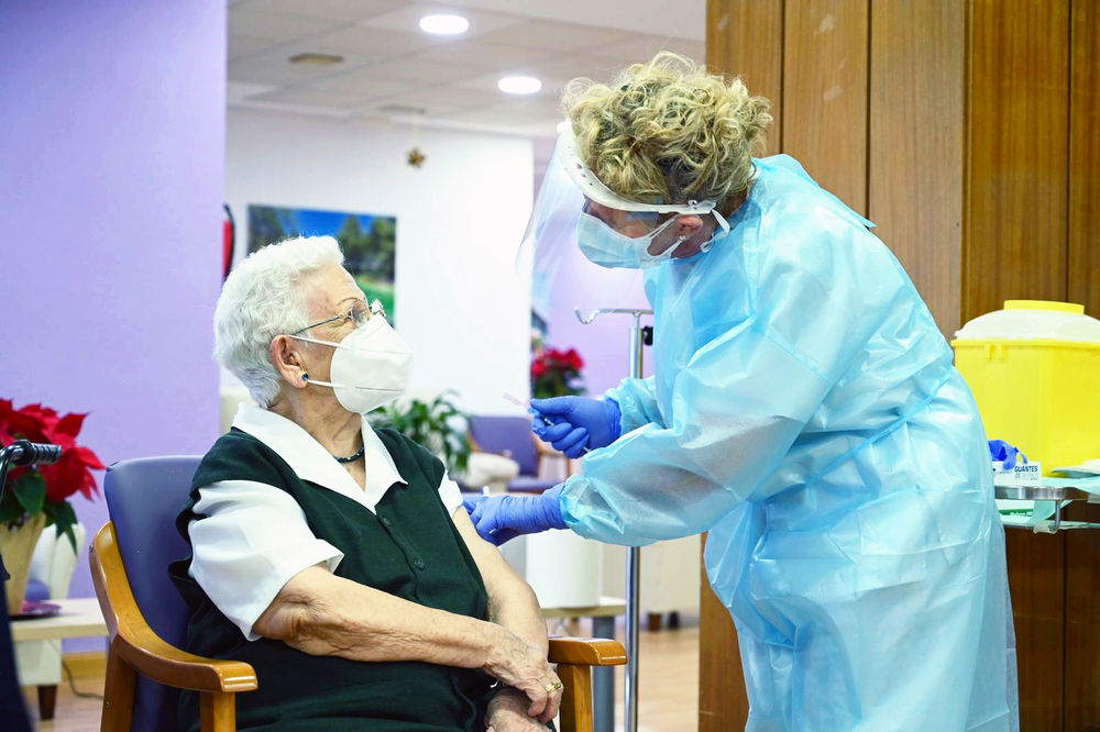 2020年12月27日,在西班牙瓜达拉哈拉的洛斯奥尔莫斯养老院,96岁的阿拉塞莉·伊达尔戈(左)接受新冠疫苗注射。阿拉塞莉·伊达尔戈是西班牙首位新冠疫苗接种者。(新华社发,西班牙首相府供图)