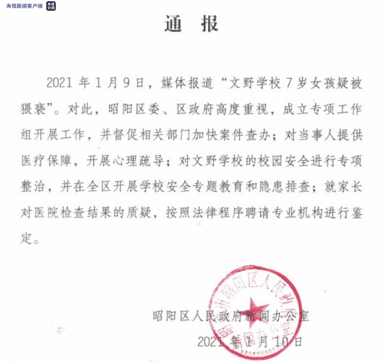 2021年1月9日,媒体报道“文野学校7岁女孩疑被猥亵”。对此,昭阳区委、区政府高度重视,成立专项工作组开展工作,并督促相关部门加快案件查办;对当事人提供医疗保障,开展心理疏导;对文野学校的校园安全进行专项整治,并在全区开展学校安全专题教育和隐患排查;就家长对医院检查结果的质疑,按照法律程序聘请专业机构进行鉴定。(总台央视记者 陈政)