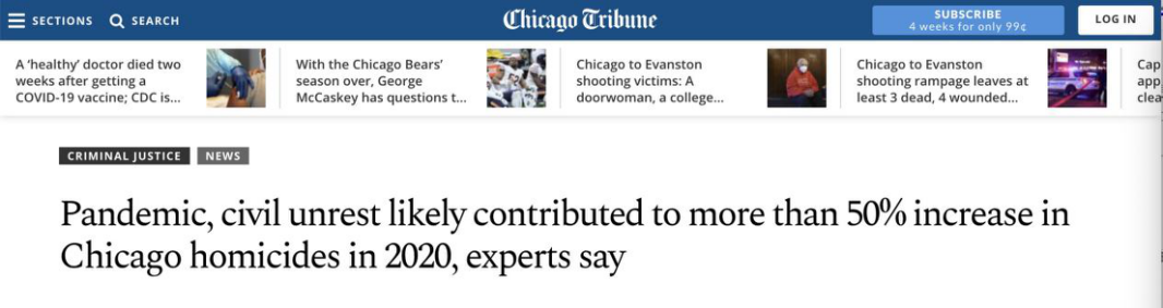 △《芝加哥论坛报》报道:专家们表示,疫情和国内骚乱导致2020年芝加哥凶杀案增加50%以上