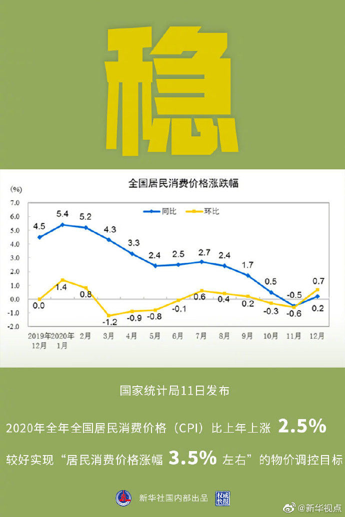 新华社北京1月11日电 题:2020年CPI稳在2.5%,2021年“价”往何处?