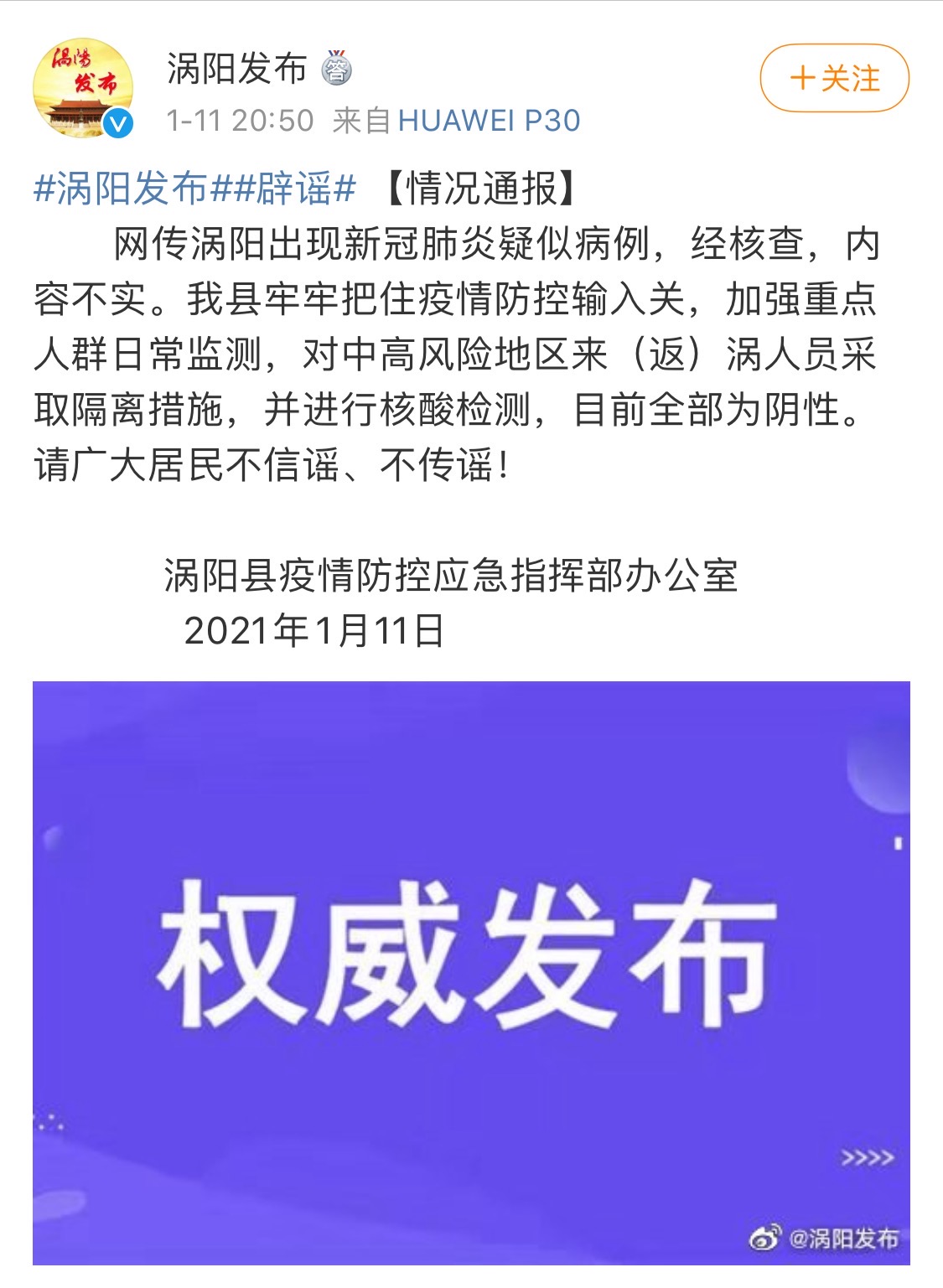 近日,网传安徽涡阳出现新冠肺炎疑似病例,今天晚上,安徽涡阳疫情防控应急指挥部办公室通过当地宣传部的官方微博“涡阳发布”对该信息进行辟谣,并予以情况通报。