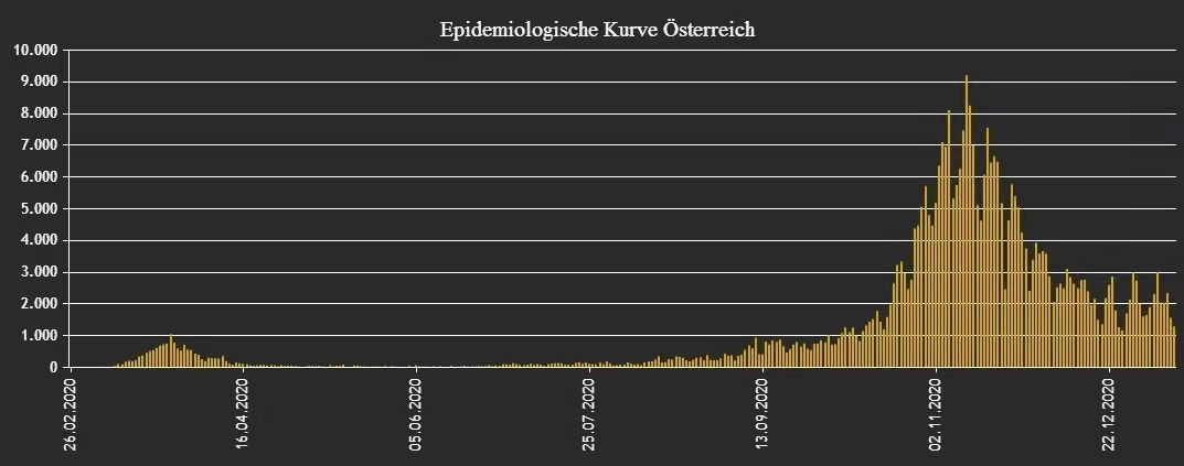 据奥地利卫生部网站消息,截至1月11日,奥地利共进行了3905482次新冠病毒检测,累计确诊病例381035例,死亡6702例,全国已有38545人接种了新冠疫苗。过去24小时,奥地利新增确诊1536例。7天内每10万人新增病例163例。