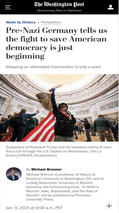 △《华盛顿邮报》认为,与纳粹前德国的相似性提醒着人们,美式民主接下来仍有很长一段路要走