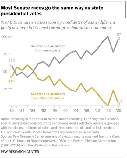 “政治极化”所导致的,是美国选民正在逐渐放弃考量候选人的具体政策和性格品质,而将其背后的党派做为唯一选择依据。皮尤研究中心1月8日刚刚发布的今年大选结果分析报告指出,在各州参议员选举和总统选举中,胜选人来自同一党派的比例已经达到惊人的97%,这是近40年来仅次于2016年的第二高点。