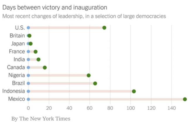 △《纽约时报》数据显示,英国、法国、日本和加拿大等国家的权力交接过程均在20天以内,而美国则需要70天以上