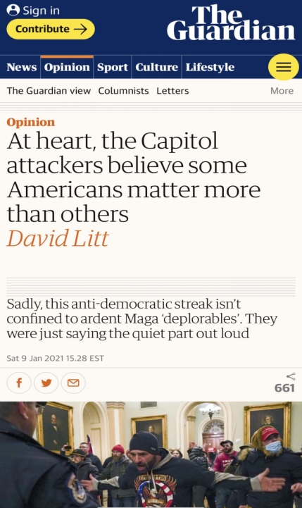 △《卫报》美国版指出,国会山事件中的暴徒相信,他们比其他美国人更重要