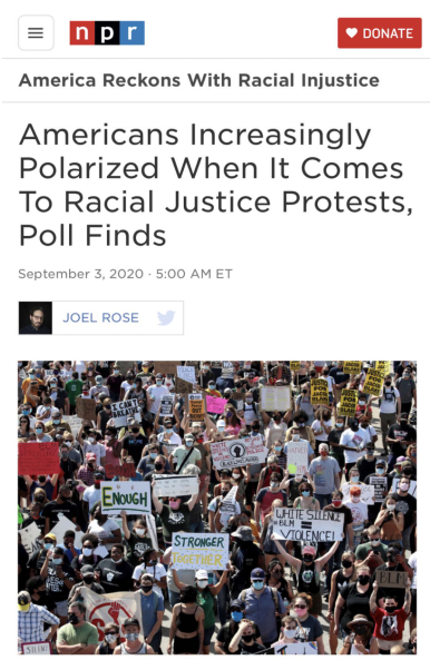 △美国国家公共广播电台报道,美国人在要求种族公平的抗议中,分歧正逐渐加大