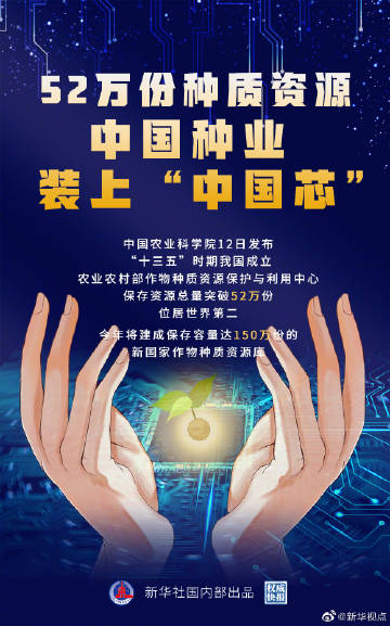 【#权威快报#|#种业装上中国芯#我国保存资源总量突破52万份位居世界第二】优异资源是种业的“芯片”。据中国农科院12日消息,“十三五”时期我国加快种质资源保护与利用体系建设,建成完善了由1座长期库、1座复份库、10座中期库、43个种质圃、205个原生境保护点以及种质资源信息中心组成的国家作物种质资源保护体系;成立了农业农村部作物种质资源保护与利用中心,保存资源总量突破52万份,位居世界第二。新国家作物种质资源库将于今年建成使用,可保存150万份种质资源,极大提升我国种质资源保护能力。(记者:于文静 海报设计:贾伊宁)