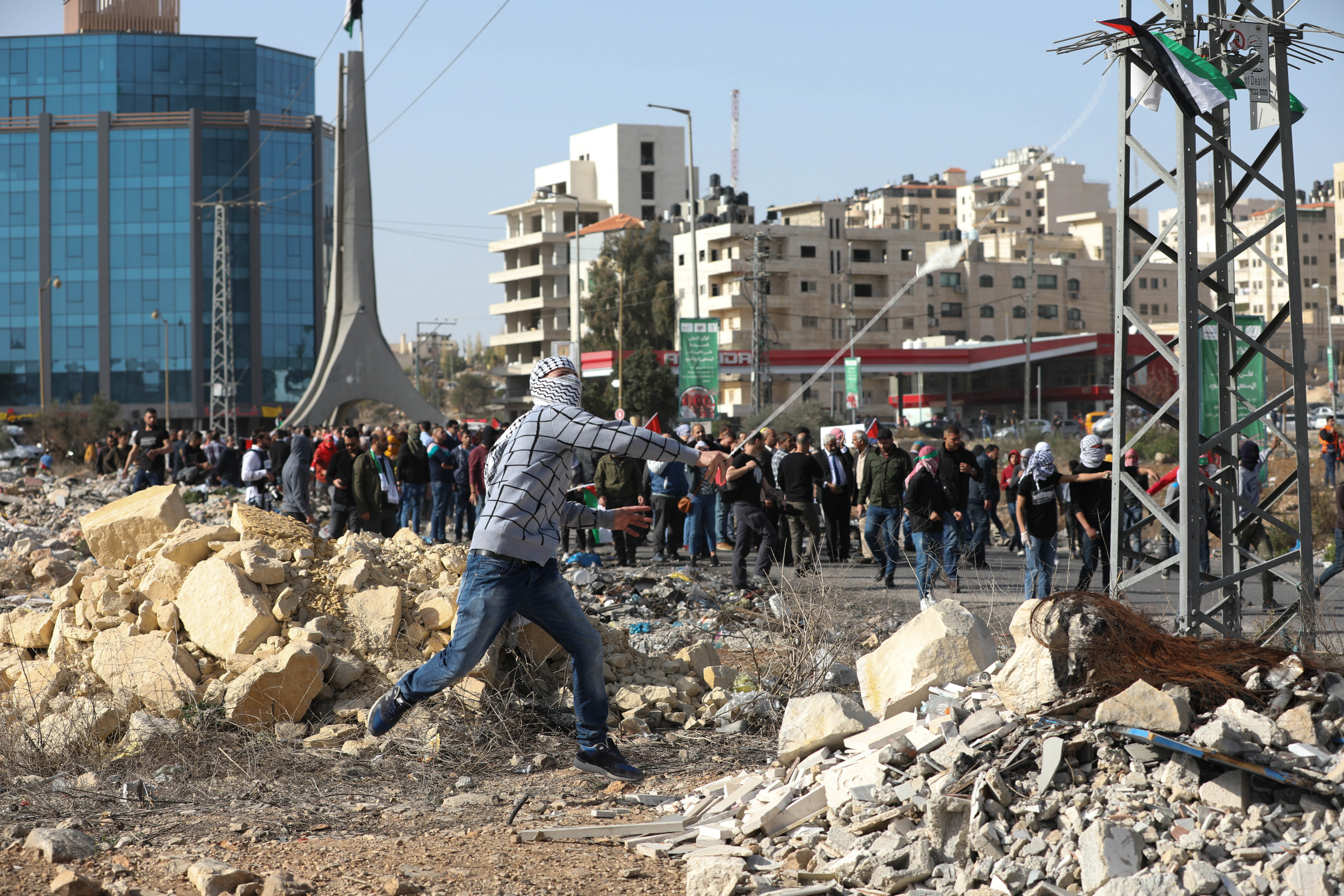 2019年11月26日,在约旦河西岸城市拉姆安拉,一名示威者向以色列检查站投掷石头。巴勒斯坦约旦河西岸地区数千民众26日举行游行集会,抗议美国政府近日改变政策,不再视约旦河西岸的犹太人定居点“不符合国际法”。(新华社记者 陈霖摄)
