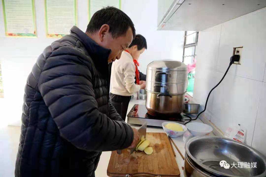 李伟白天不仅要授课,中午还要兼任厨师给孩子们做营养午餐,下课间隙,他先去把饭煮着,然后再在旁边自己种的一小块青菜地里摘一些菜,等上完早上最后一节课,他就带着学生们一起做饭、收拾。