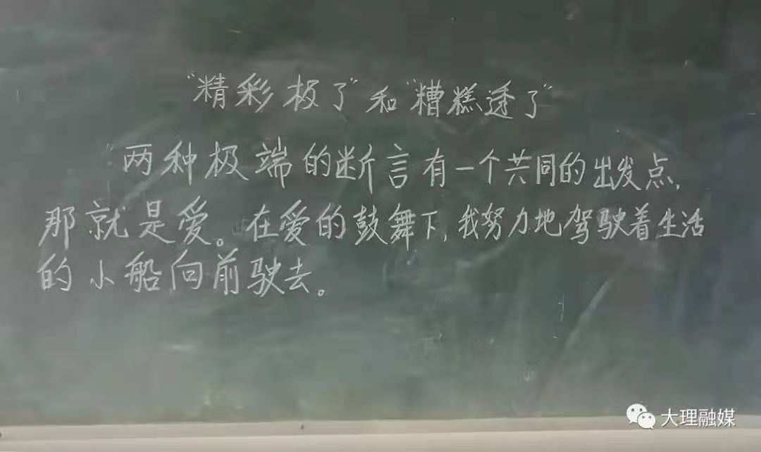 我们准备离开花椒箐小学时,教室的黑板上李伟工整地写着当天课文《精彩极了和糟糕透了》的一段话:在爱的鼓舞下,我努力地驾驶着生活的小船向前驶去。
