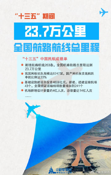 【“十三五”期间#中国民航成绩单#】2020年,中国民航“十三五”圆满收官!在12日举行的2021年全国民航工作会议上,最新数据显示,“十三五”期间,新增航路航线263条,全国航路航线总里程达到23.7万公里。我国民航机队规模达6747架,国产民机在支线机队中的比例达33%。基础设施建设总投资4608亿元,新建、迁建运输机场43个,全国颁证运输机场数量增加到241个。机场新增设计容量约4亿人次,总容量达14亿人次。(记者周圆)