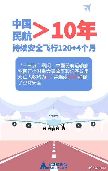 【120+4个月!#中国民航持续安全飞行超10年#】坚守安全底线!来自中国民用航空局的最新统计显示,“十三五”期间,中国民航运输航空百万小时重大事故率和亿客公里死亡人数均为0,并连续18年确保了空防安全。截至目前,持续安全飞行“120+4”个月,安全水平稳居世界前列。(记者周圆)