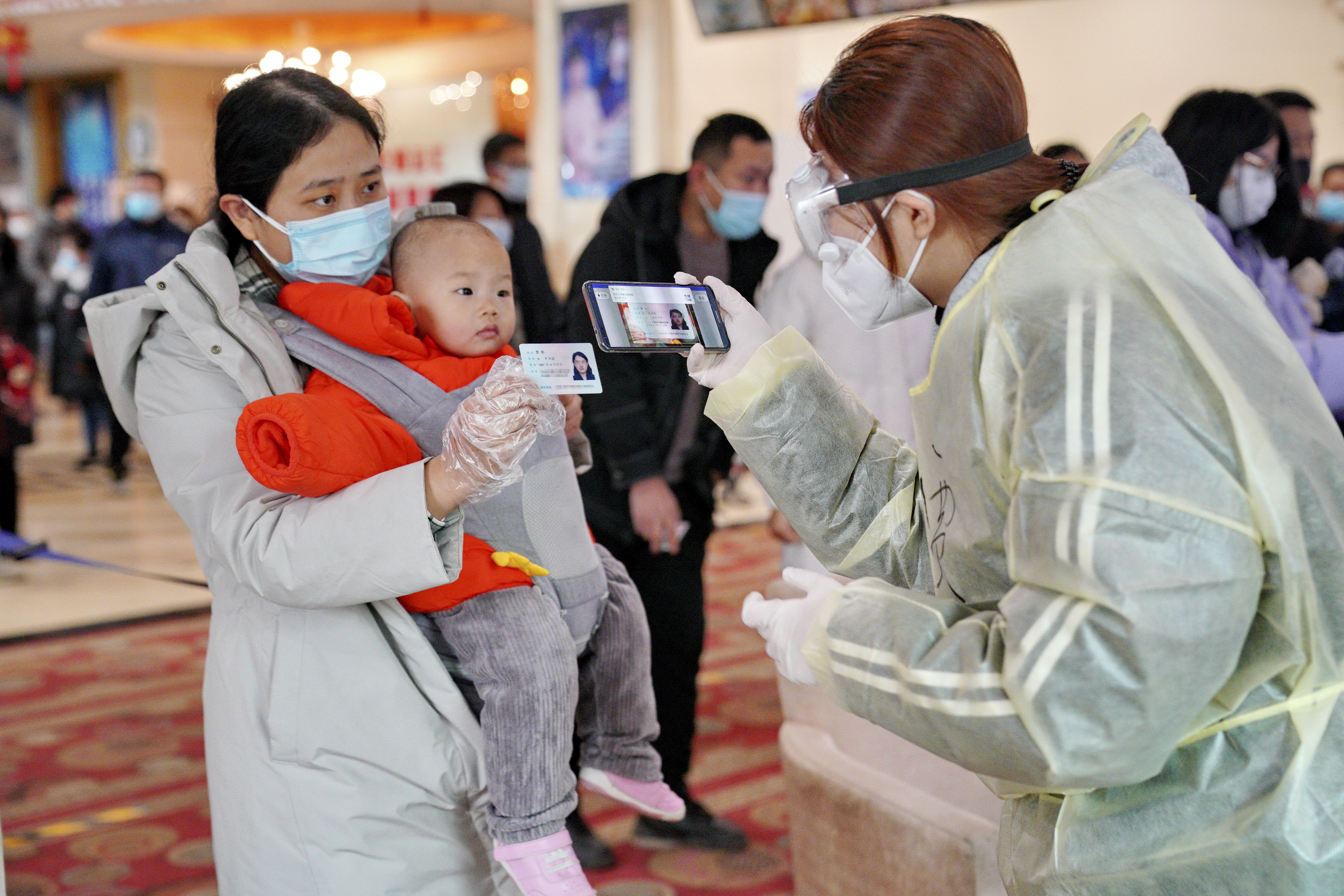 ↑ 1月12日,工作人员在河北省石家庄市桥西区恒大城社区内为居民录入身份信息。 新华社记者 牟宇 摄