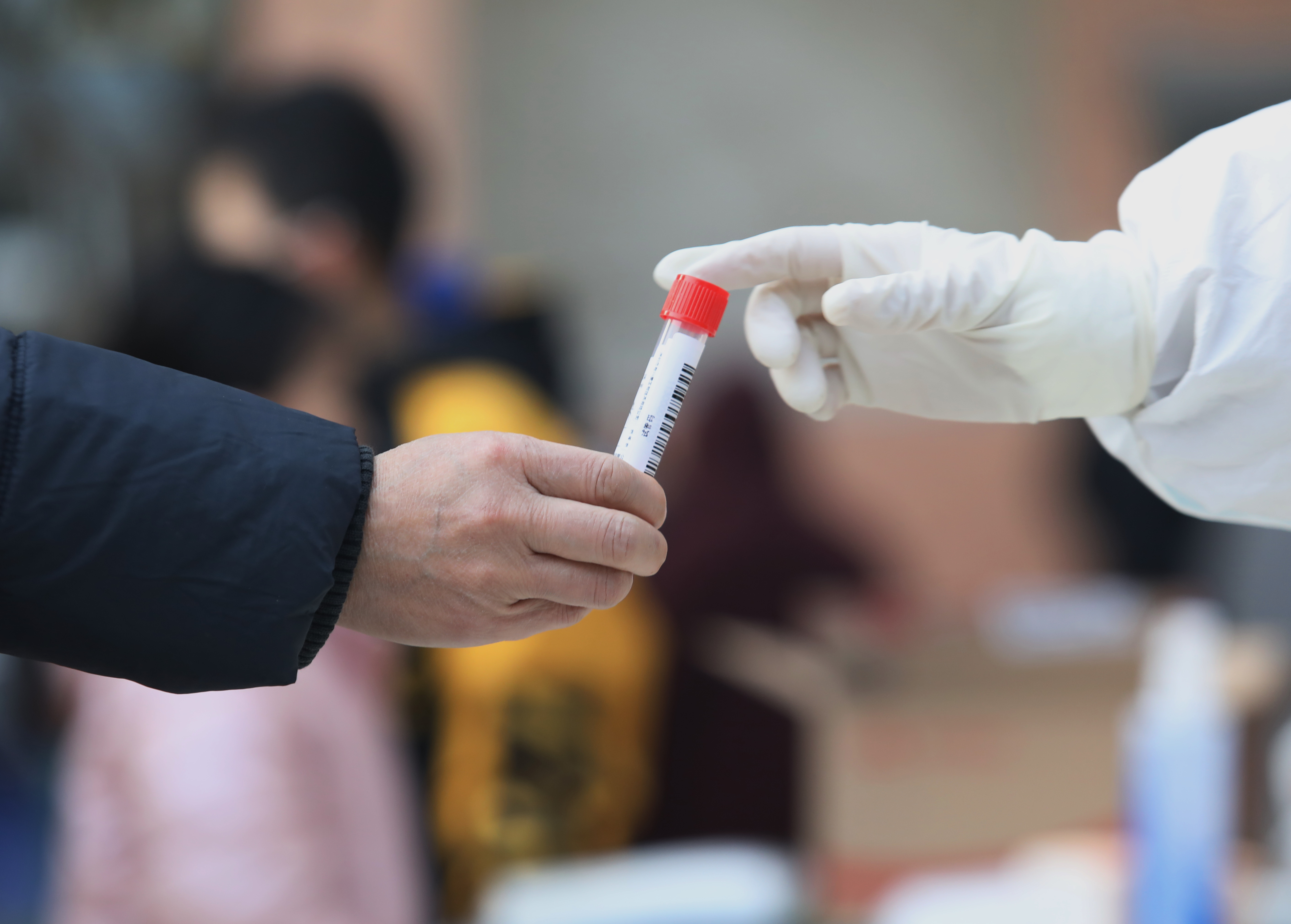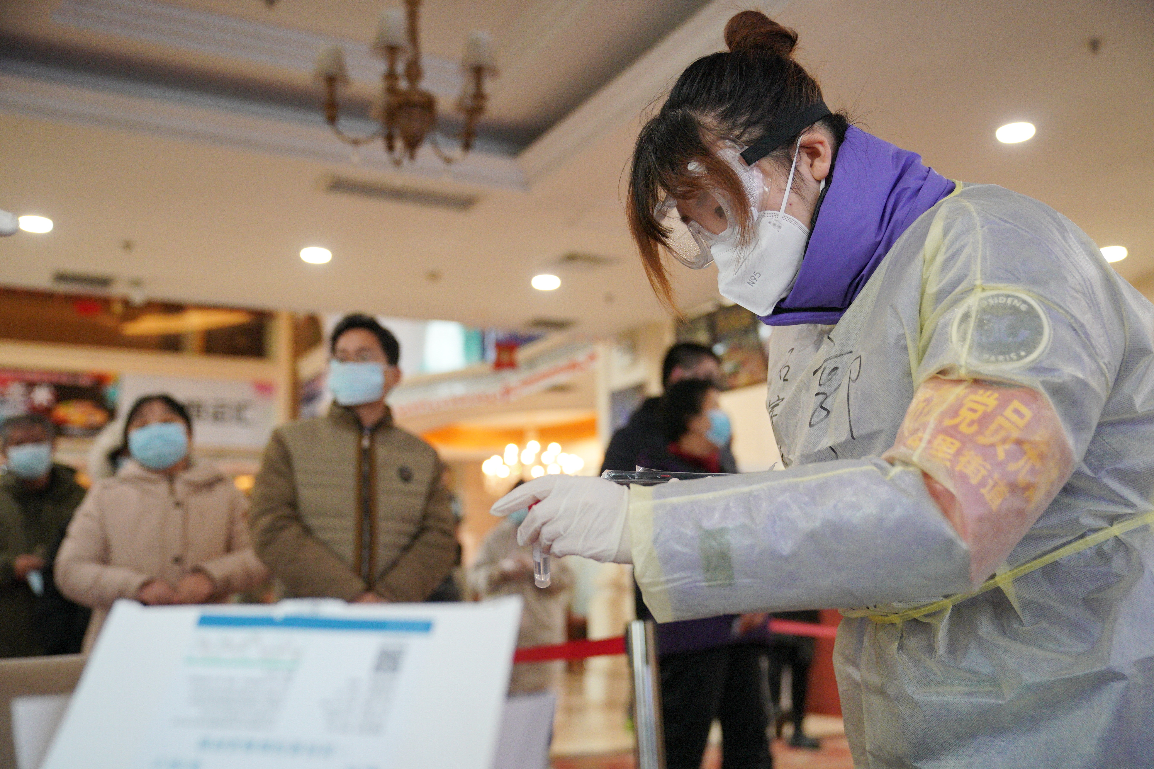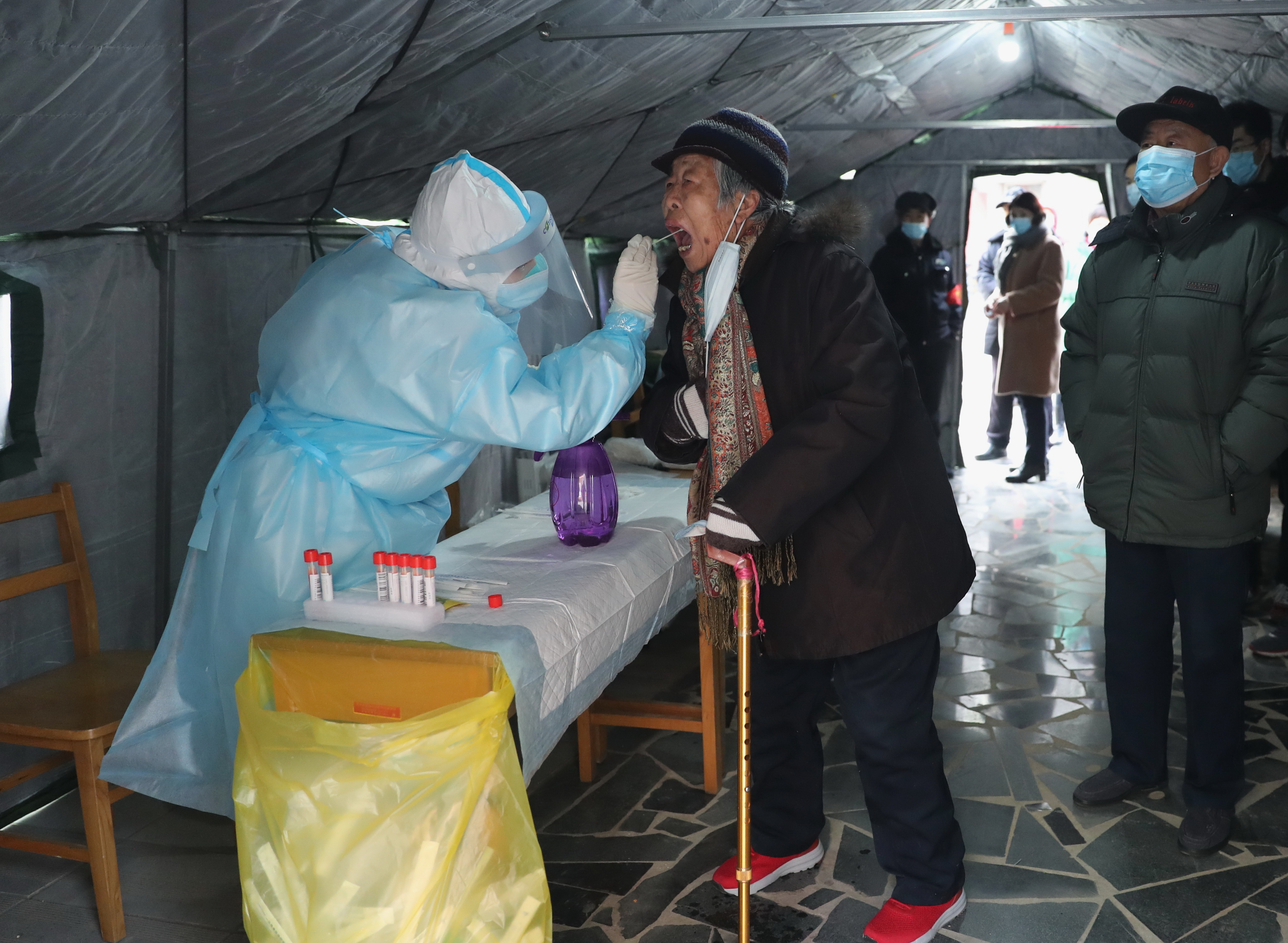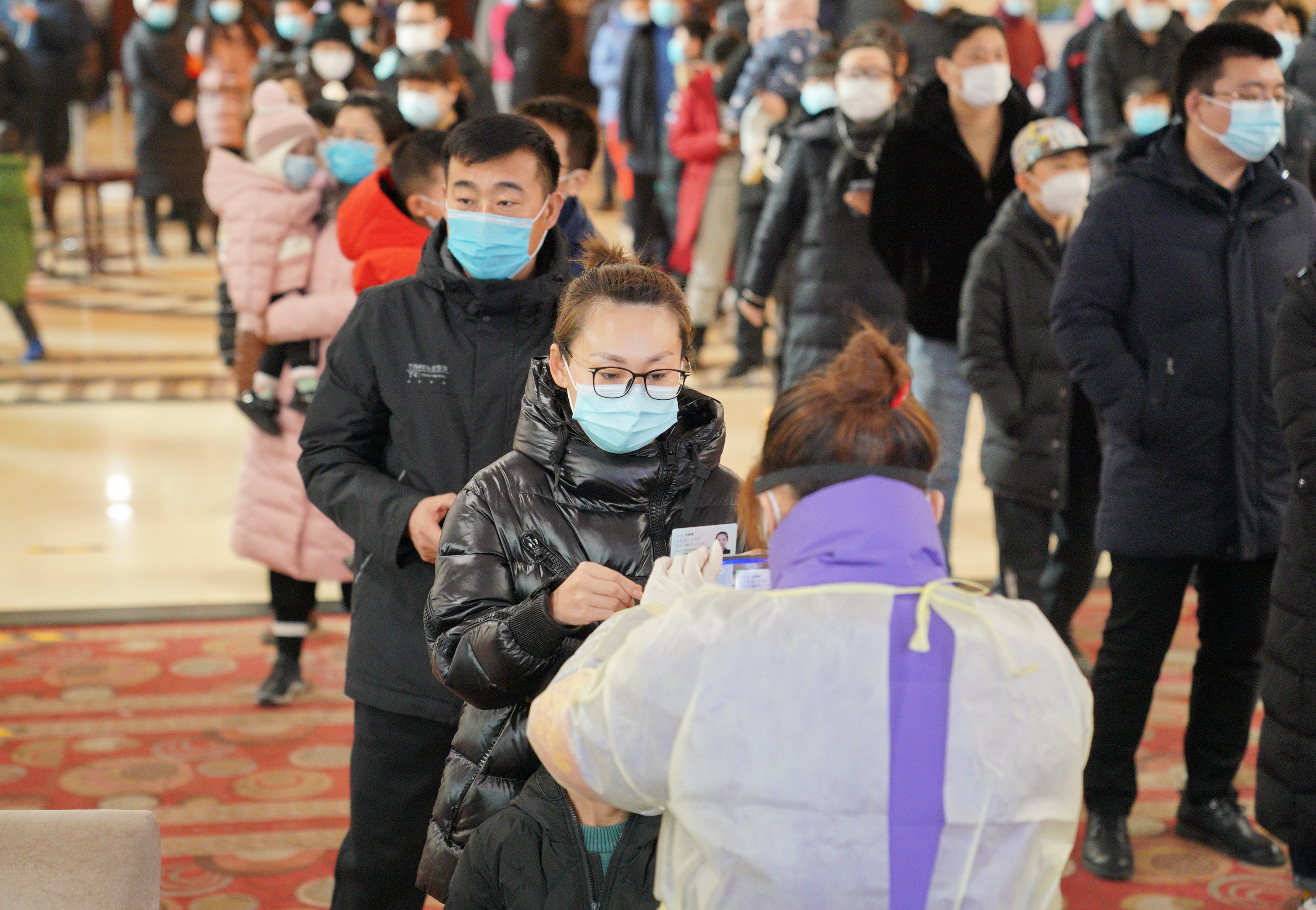 ↑ 1月12日,检测人员在河北省石家庄市桥西区恒大城社区内为居民进行核酸采样。 新华社记者 牟宇 摄