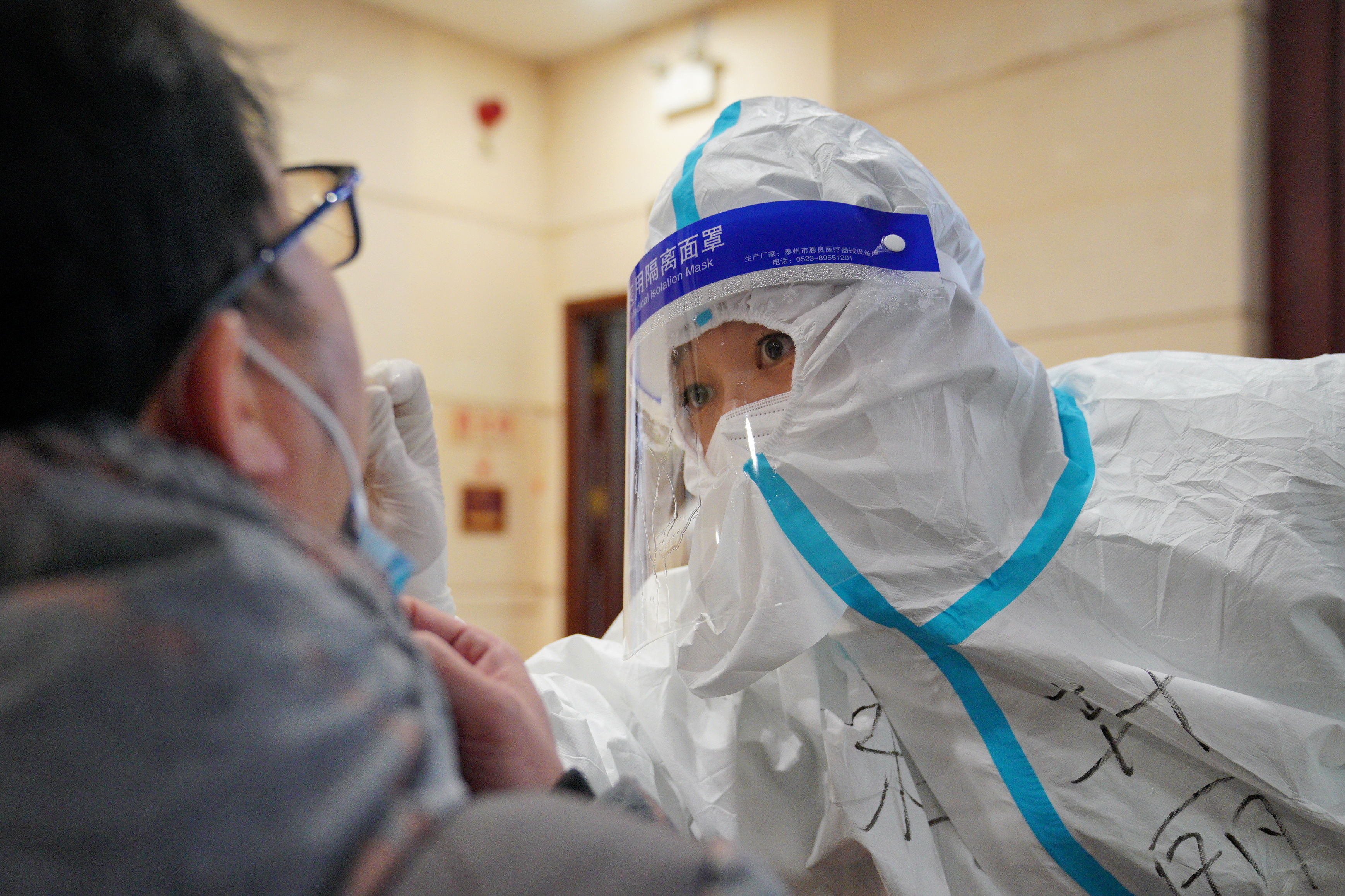 ↑ 1月12日,医护人员在石家庄市新华区锦绣乾城社区为居民进行核酸采样。 新华社发(梁子栋 摄)