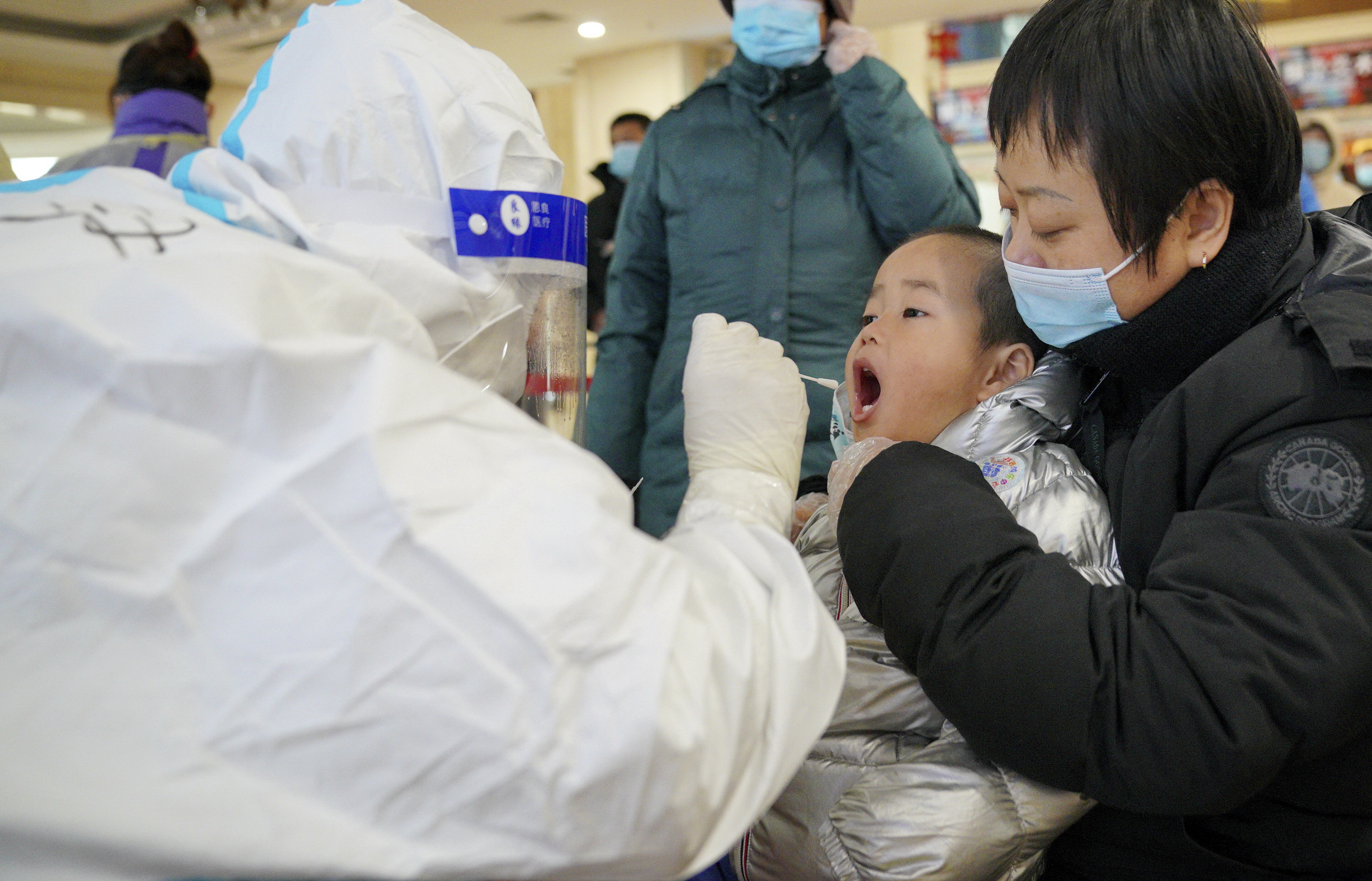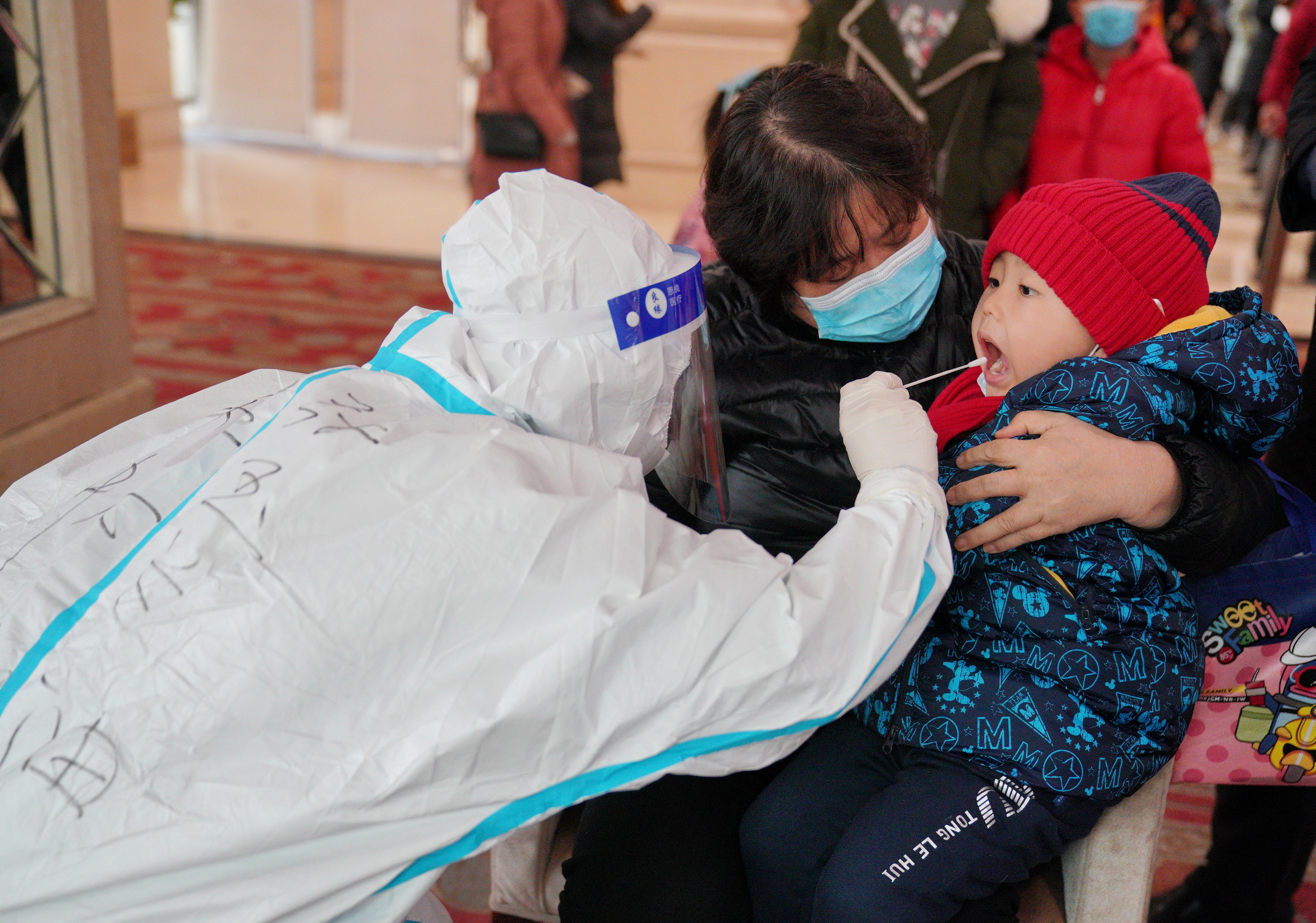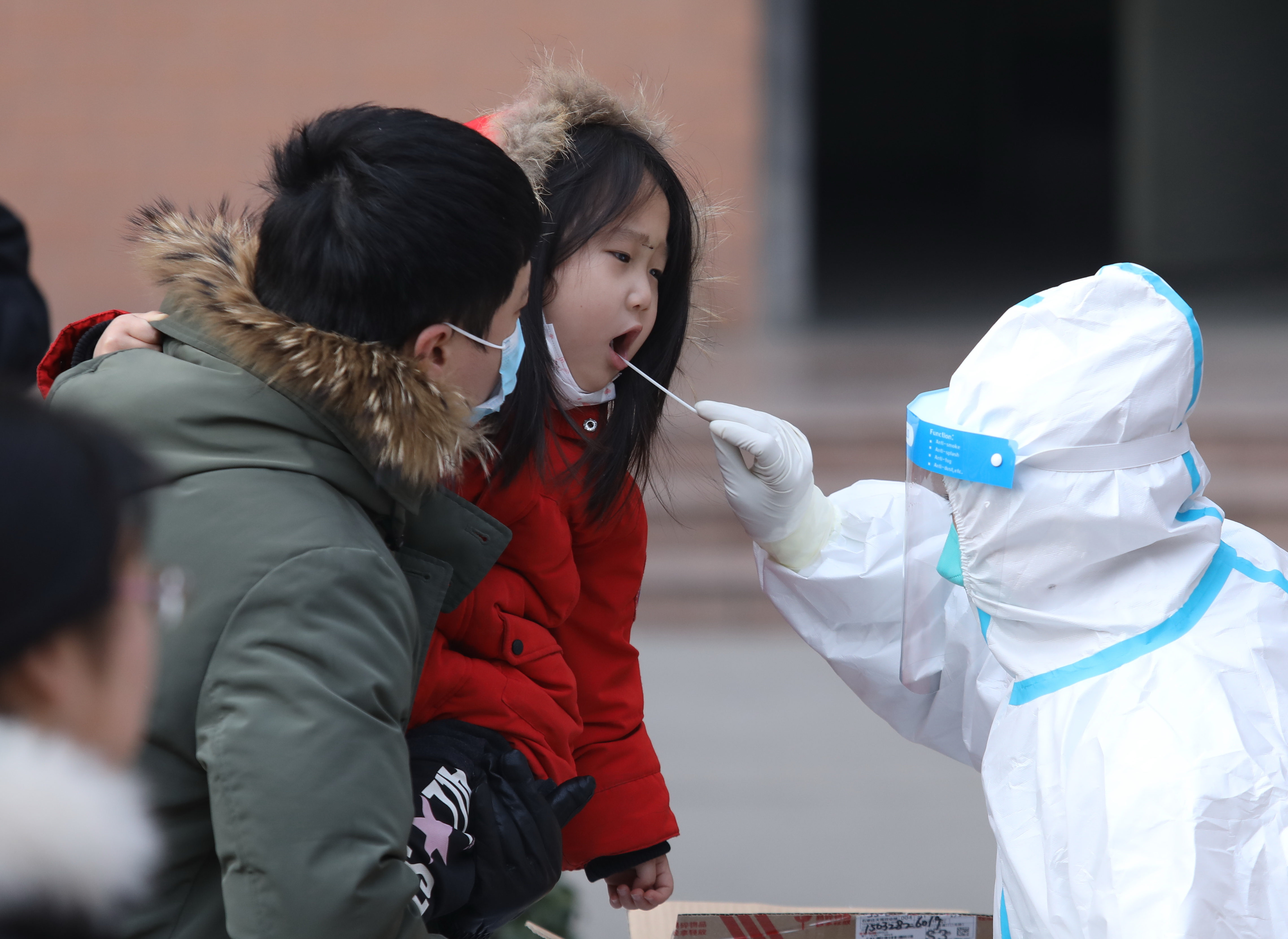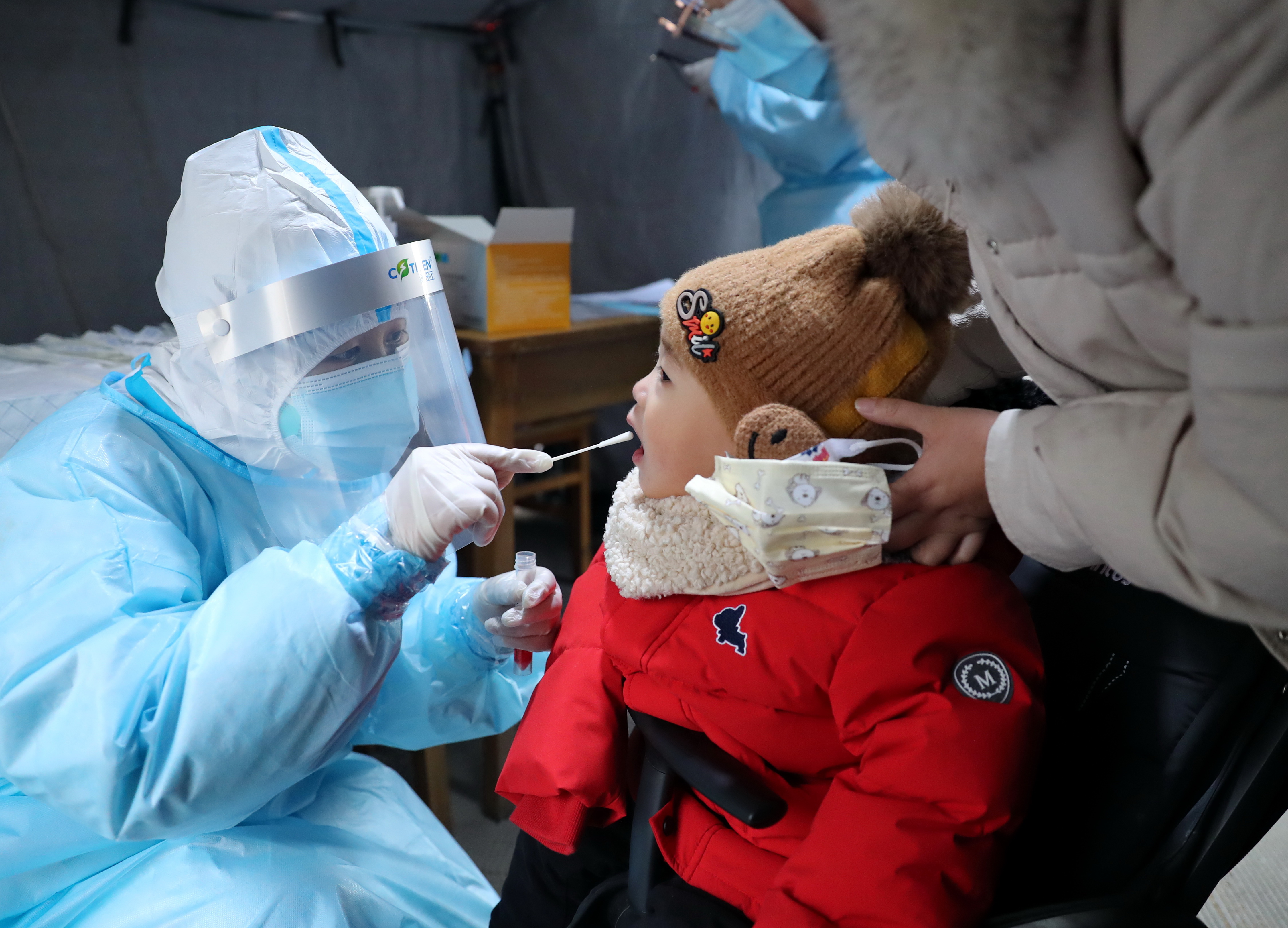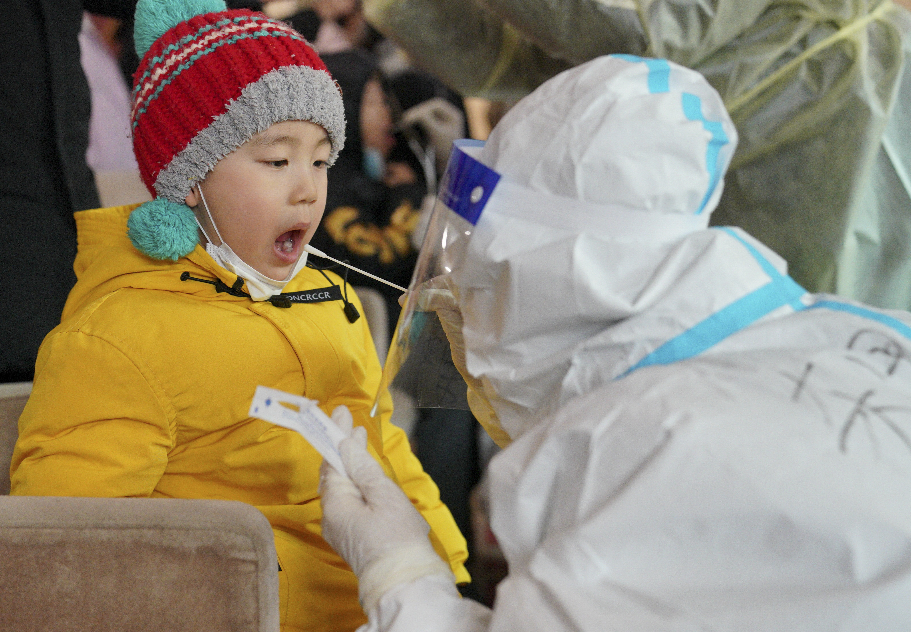 ↑ 1月12日,检测人员在河北省石家庄市桥西区恒大城社区内为一名小朋友进行核酸采样。 新华社记者 牟宇 摄