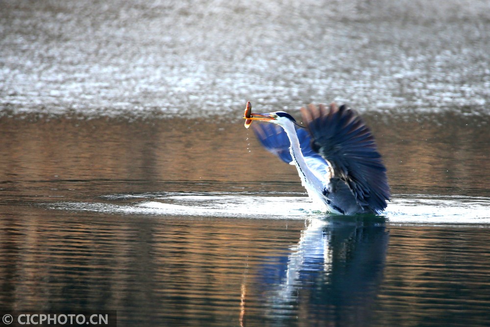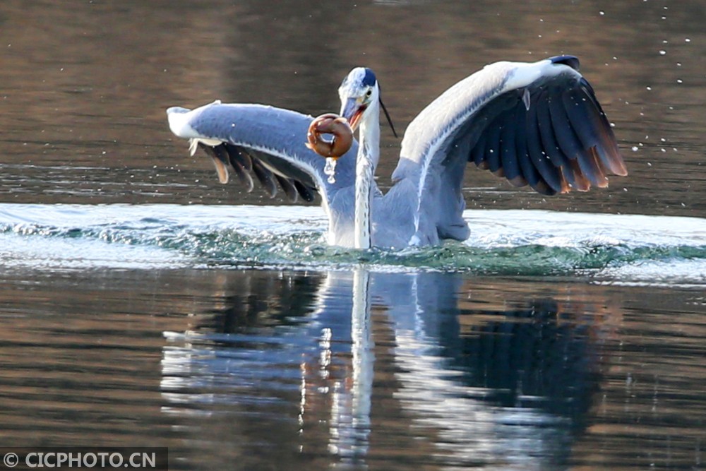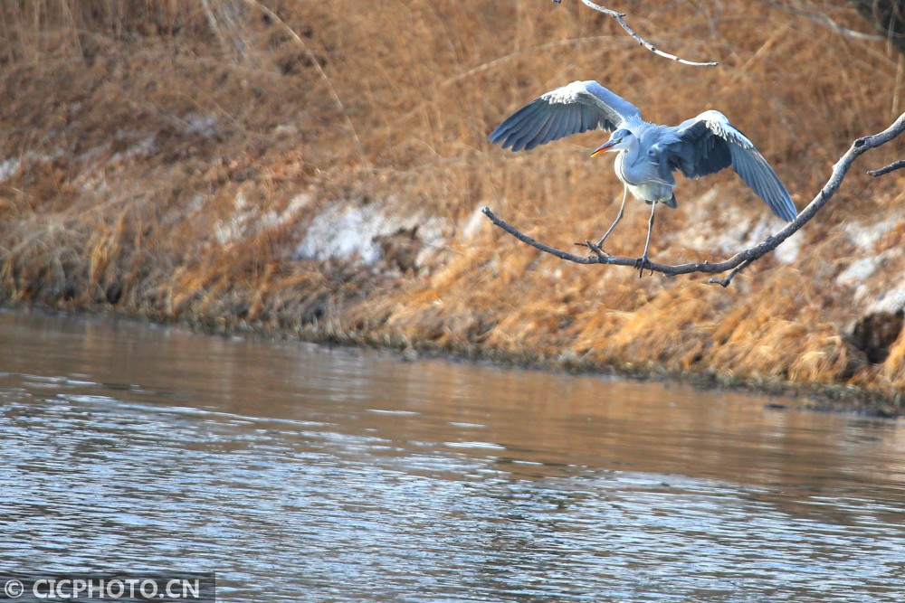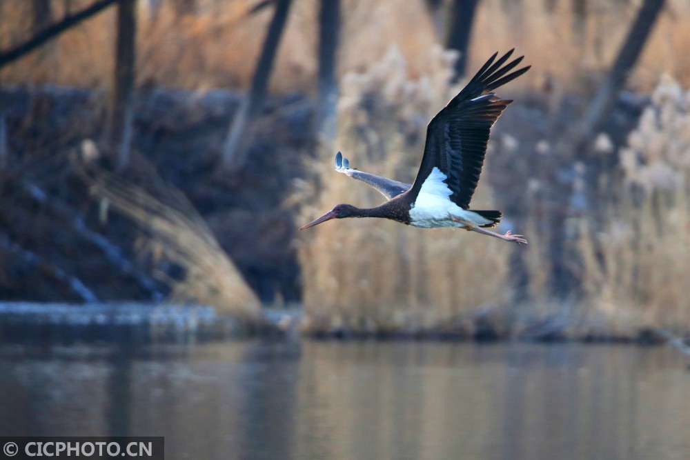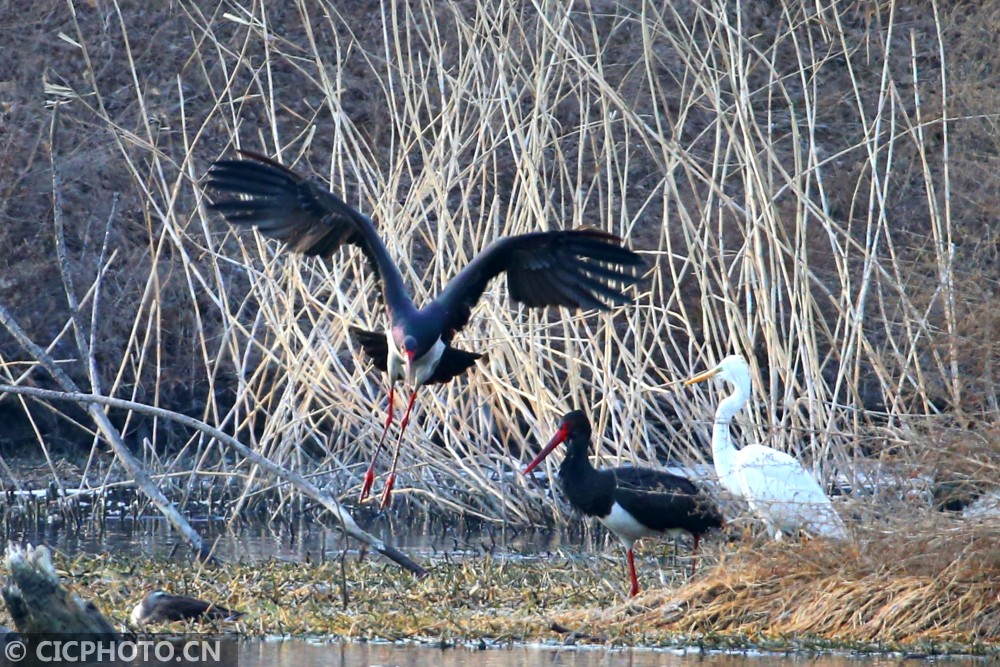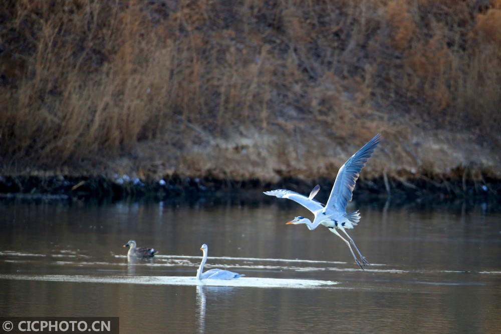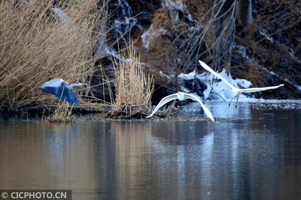 以上图片:2021年1月10日,北京房山燕山石化牛口峪湿地公园,黑鹳、苍鹭、白鹭等众多鸟类在觅食。CICPHOTO/郭俊锋 摄