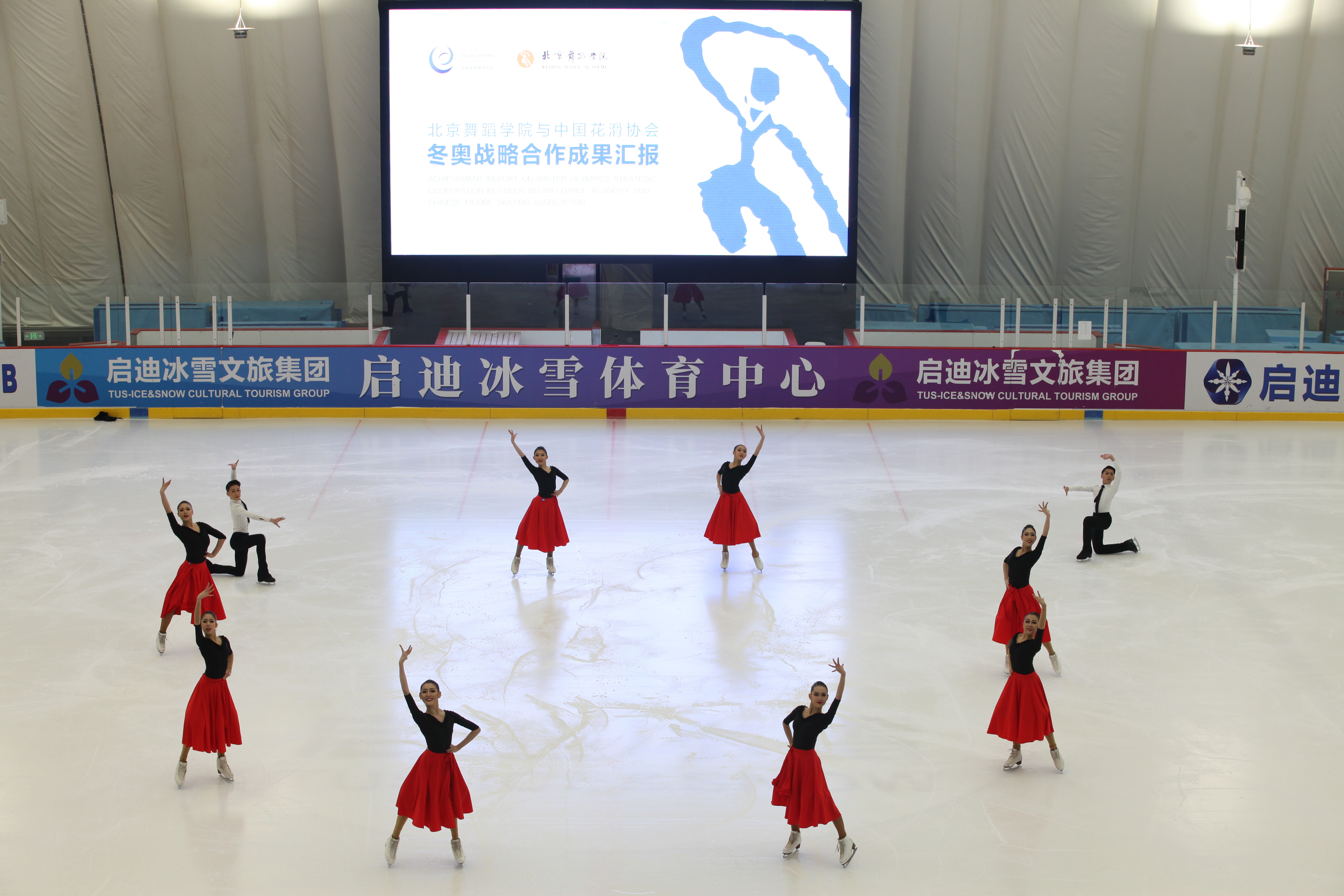 汇报会上,北京舞蹈学院高水平运动队的冰舞运动员陈溪梓/邢珈宁、北舞附中跨界冰舞运动员以及2019级花滑班的学生们进行了表演,包括冰上展示和舞蹈展示两部分。