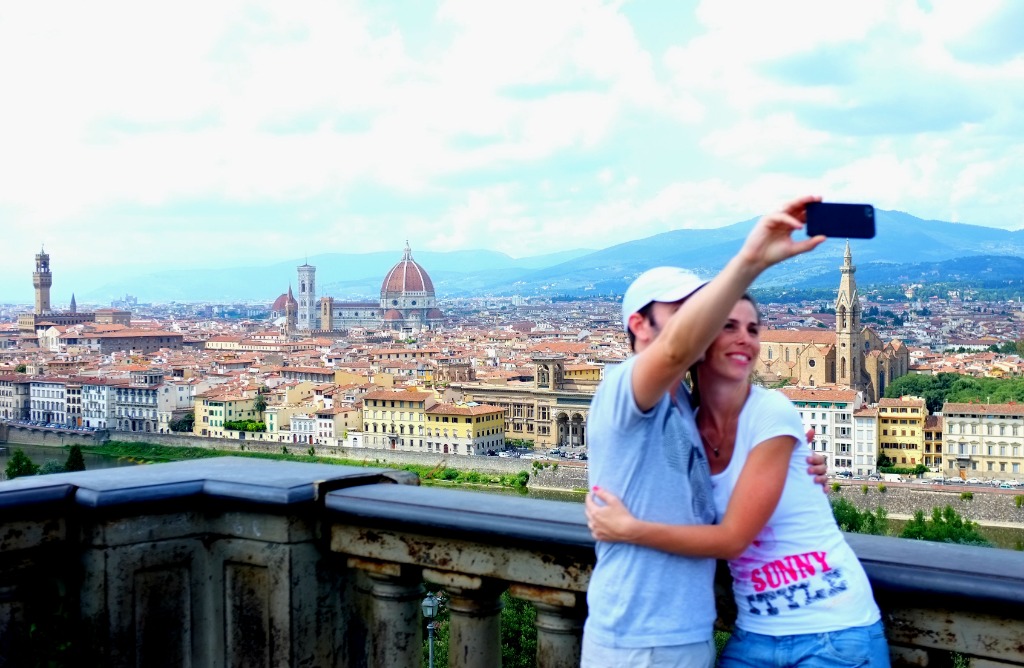 图为2014年7月25日,在意大利佛罗伦萨米开朗琪罗广场,两位游客在用相机自拍。(新华社记者许逆之摄)
