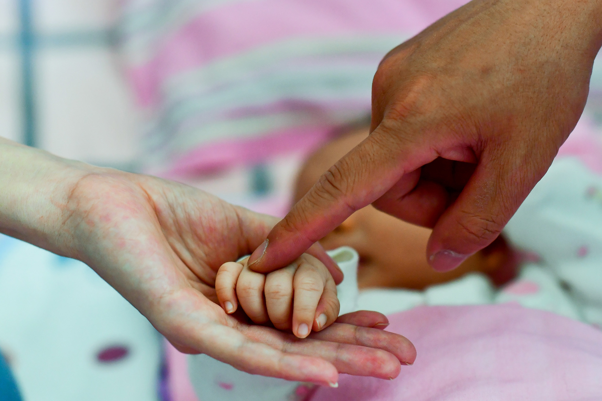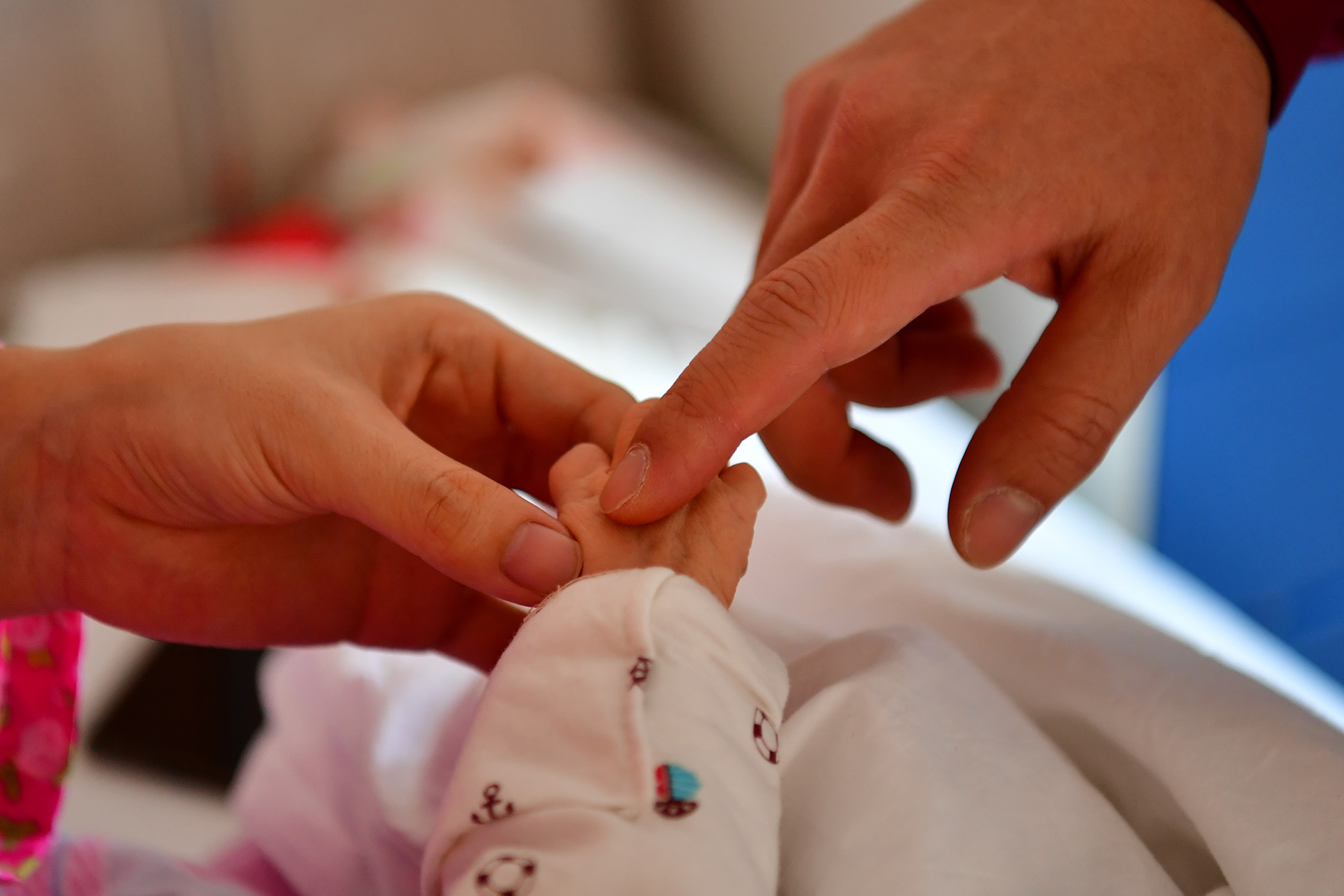 ▲2020年4月11日,郝铁蛋(右)与妻子在抚摸女儿的小手。