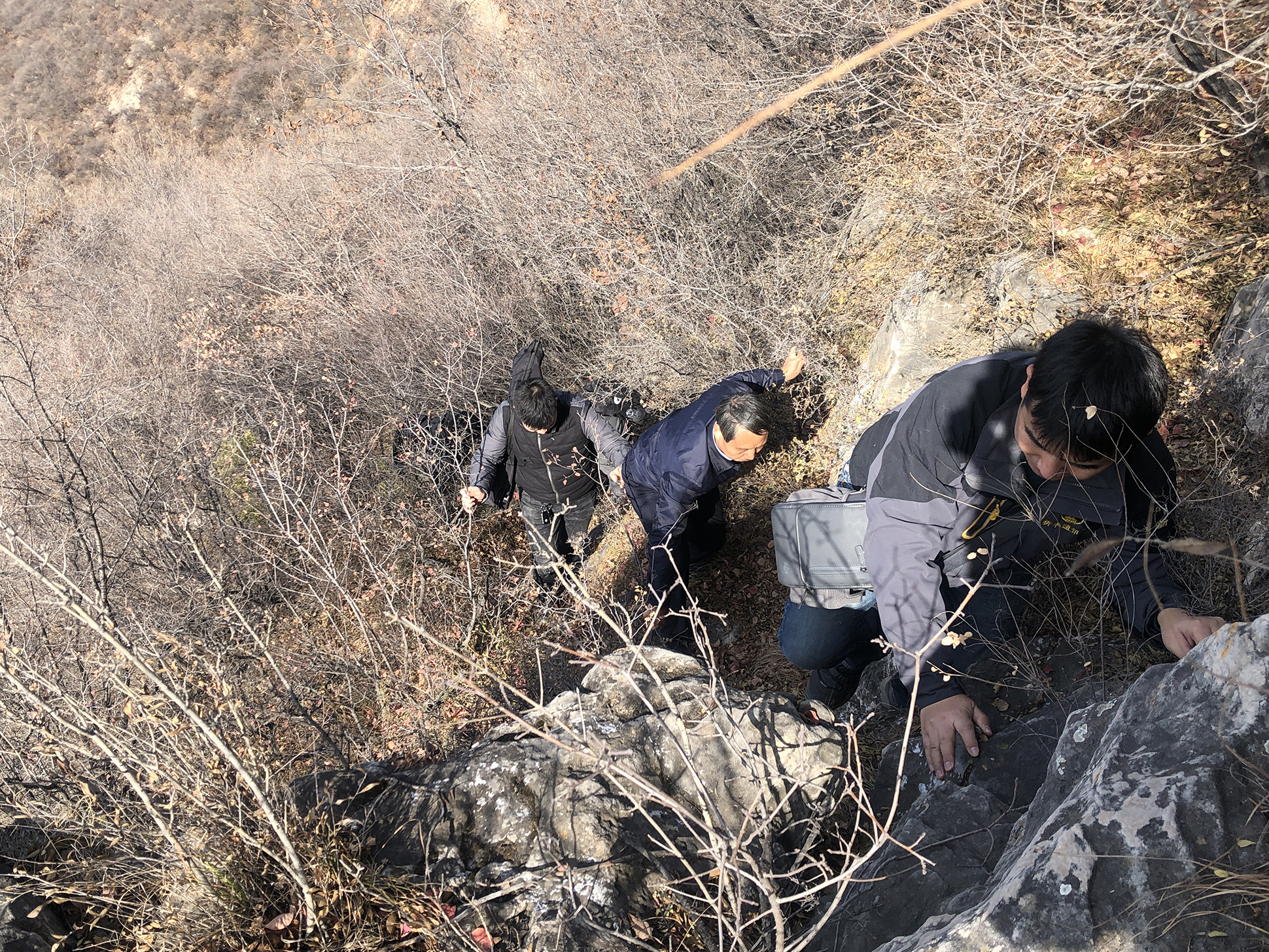 深秋的太行山,落叶满地,到处都是荆棘灌木。太行山上没有路,我们只能踏着松软的、被落叶铺满的泥土,双手抓着树干像猴子一样向山上攀登。同事们虽然下乡经验丰富,但要爬上这样的“野山”还是困难重重,陡峭的山上几乎没有放脚的地方,很多路程我们都是蹲着、跪着、爬着过去的。