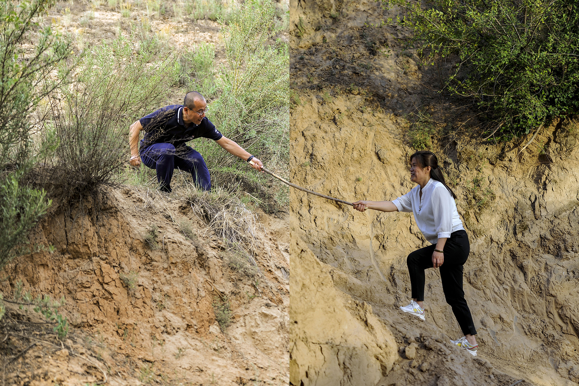 ▲“扶贫夫妻档”拼版照片:左图为2020年6月10日拍摄的山西省岚县井峪堡村第一书记刘志军在帮助扶贫工作队队员爬山坡(曹阳摄);右图为2020年6月3日拍摄的山西省兴县南通村第一书记李翠叶在扶贫工作队队员的帮助下爬山坡(新华社发 刘亮亮摄)。