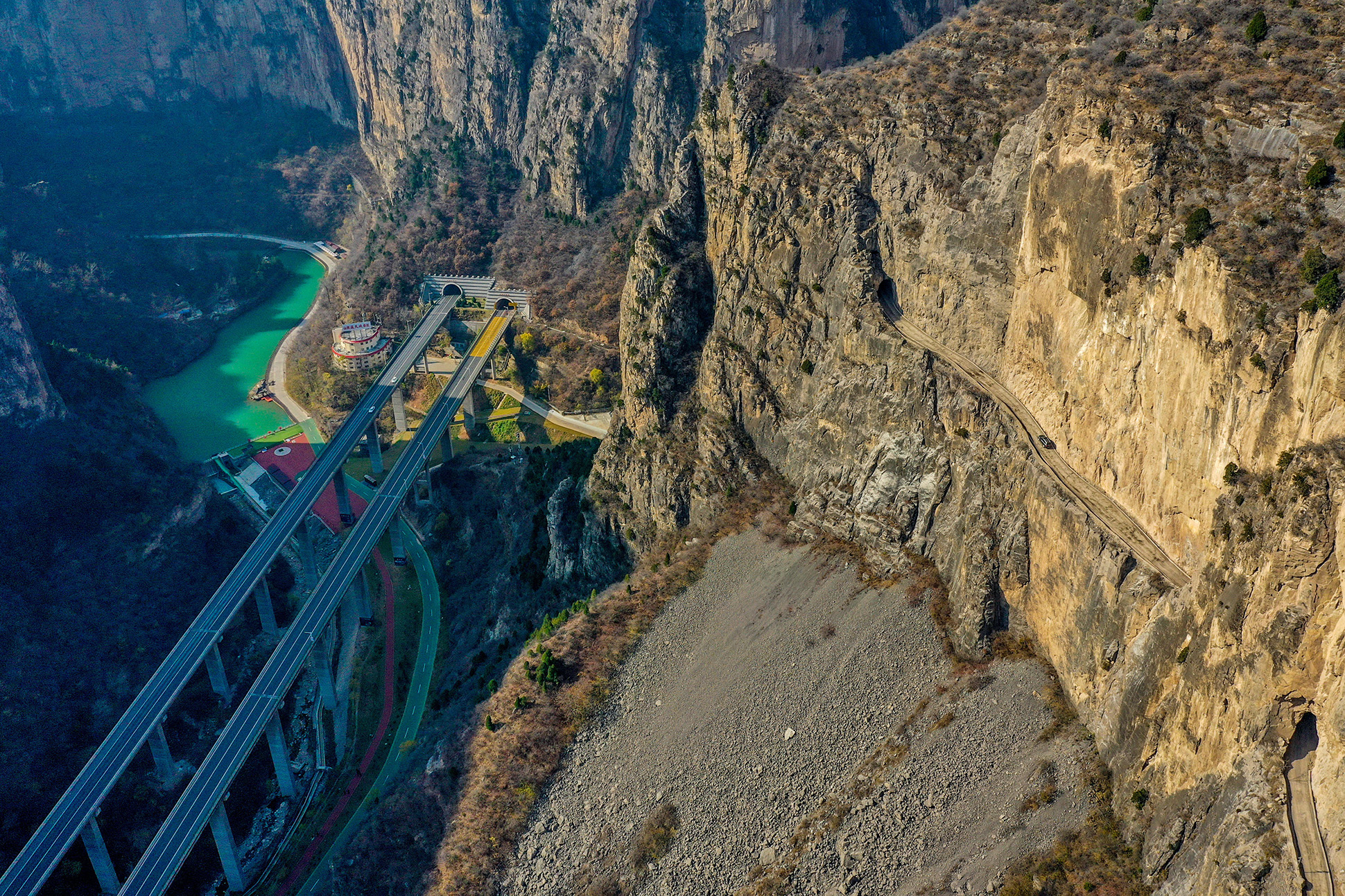 ▲2020年11月12日,在山西省长治市平顺县虹梯关乡虹霓村附近拍摄的高速公路(左),过去,当地村民只能走“挂壁公路”(右)。