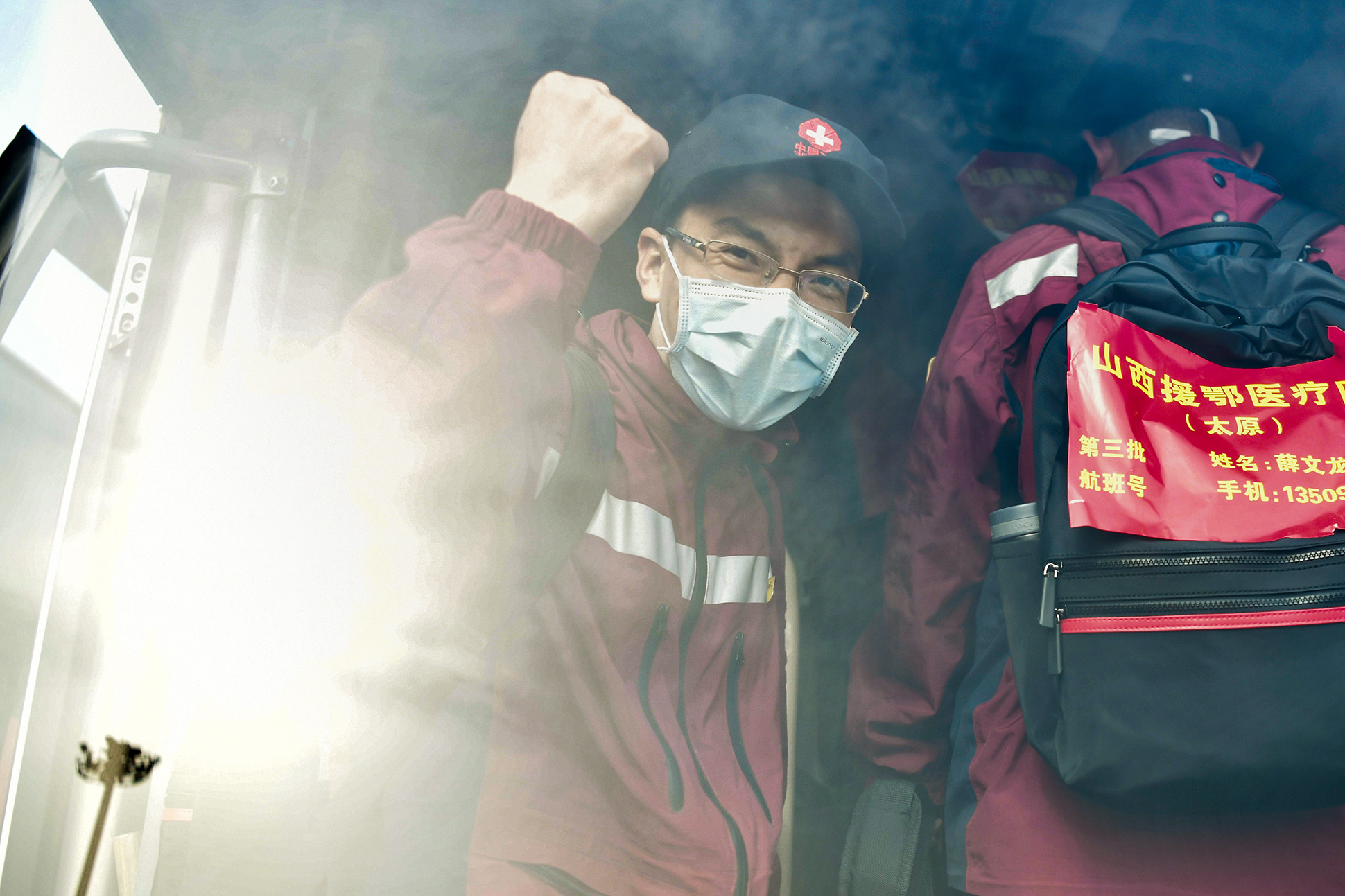 ▲2020年2月15日,山西省第八批支援湖北医疗队队员准备登机出发。
