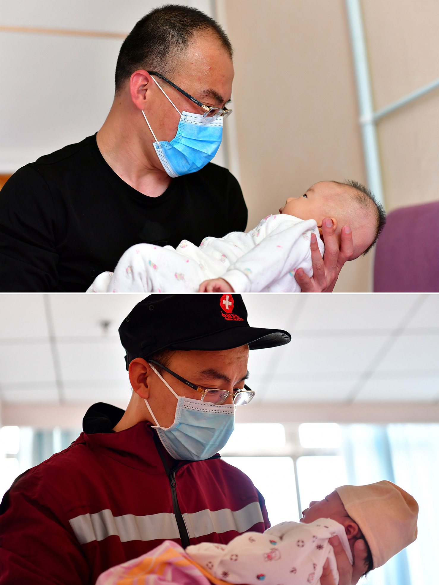 ▲拼版照片:上图为2020年4月11日,郝铁蛋回家后抱着女儿;下图为2020年2月4日,郝铁蛋临行前抱着女儿。