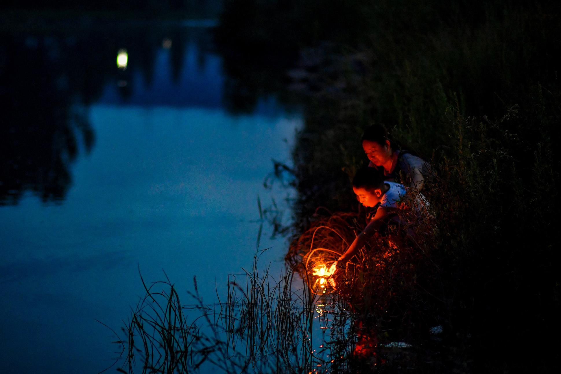▲宋昊阳和妈妈在山西省临汾市安泽县府城镇飞岭村的河边放河灯。