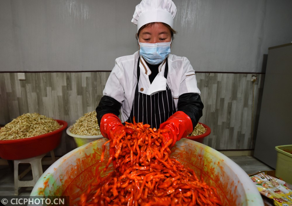 ↑2021年1月11日,贵州省毕节市黔西县莲城街道双桥社区,村民在拌和“麻辣脆”成品。CICPHOTO/罗兴祥 摄