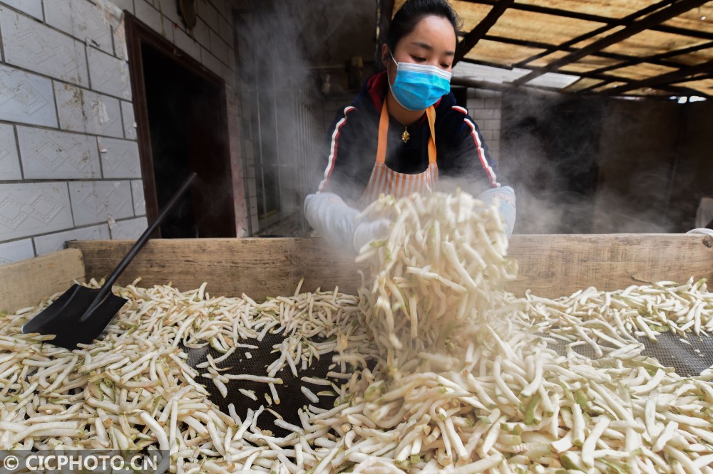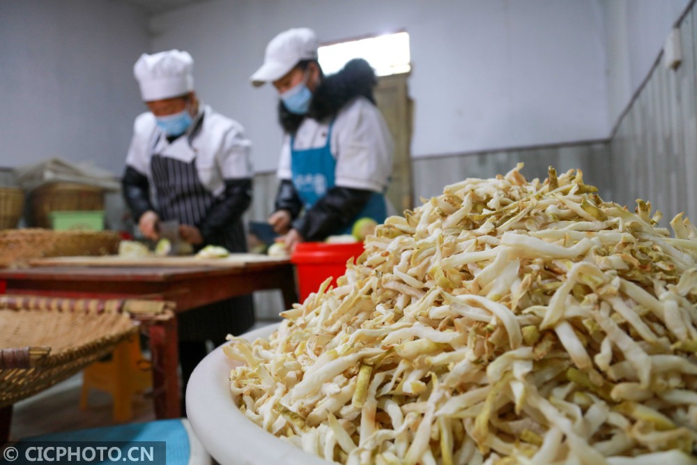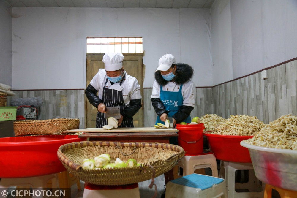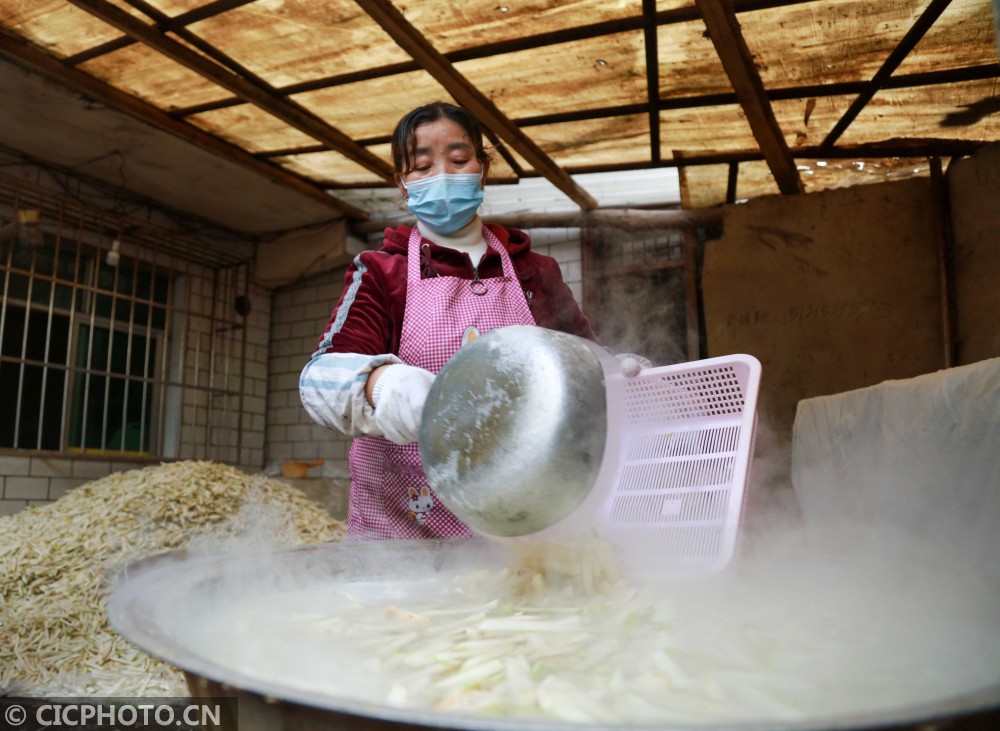 ↑2021年1月11日,贵州省毕节市黔西县莲城街道双桥社区,村民在焗大头菜丝。CICPHOTO/周训超 摄